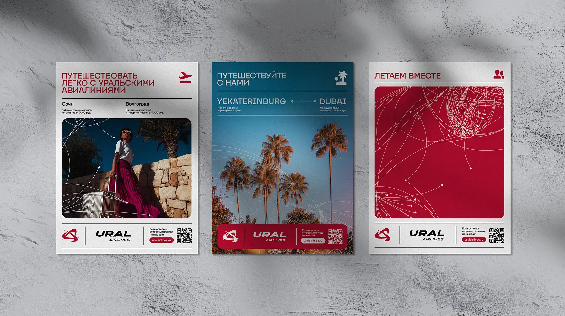 緊接著,品牌設計的主色調得以確立,并引入了全新的航線網絡圖形元素。這些圖形元素以線條或點陣的形式,直觀地展現了烏拉爾航空從各大城市起飛的航線網絡,仿佛一張錯綜復雜的“空中交通網”。在品牌視覺呈現中,這些網絡圖被巧妙地抽象為圖形紋理,廣泛應用于海報、網頁及包裝設計中,為品牌形象增添了獨特的視覺魅力。