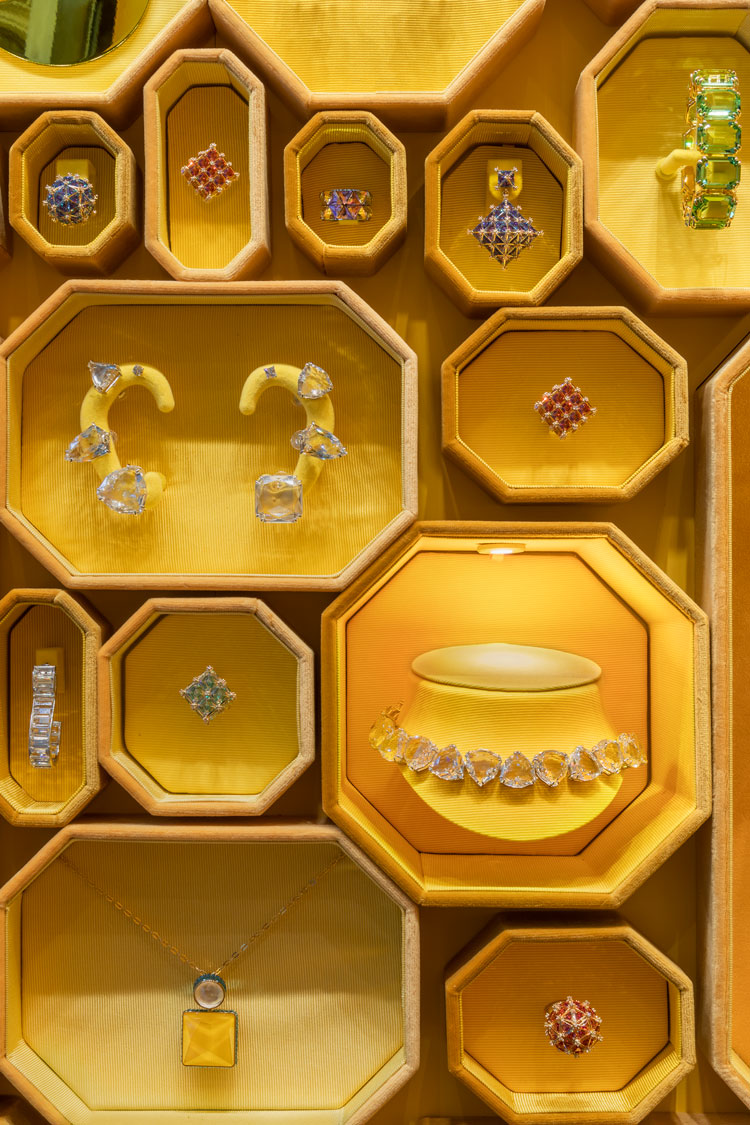 展示柜的靈感來自于新徽標;團隊說,八角形的盒子形成了“墻的重復動機”,旨在創(chuàng)造一個“文本突出的展示空間”。它補充說,“糖果色的內(nèi)飾”從照明水晶產(chǎn)生的棱柱形色彩中汲取靈感。