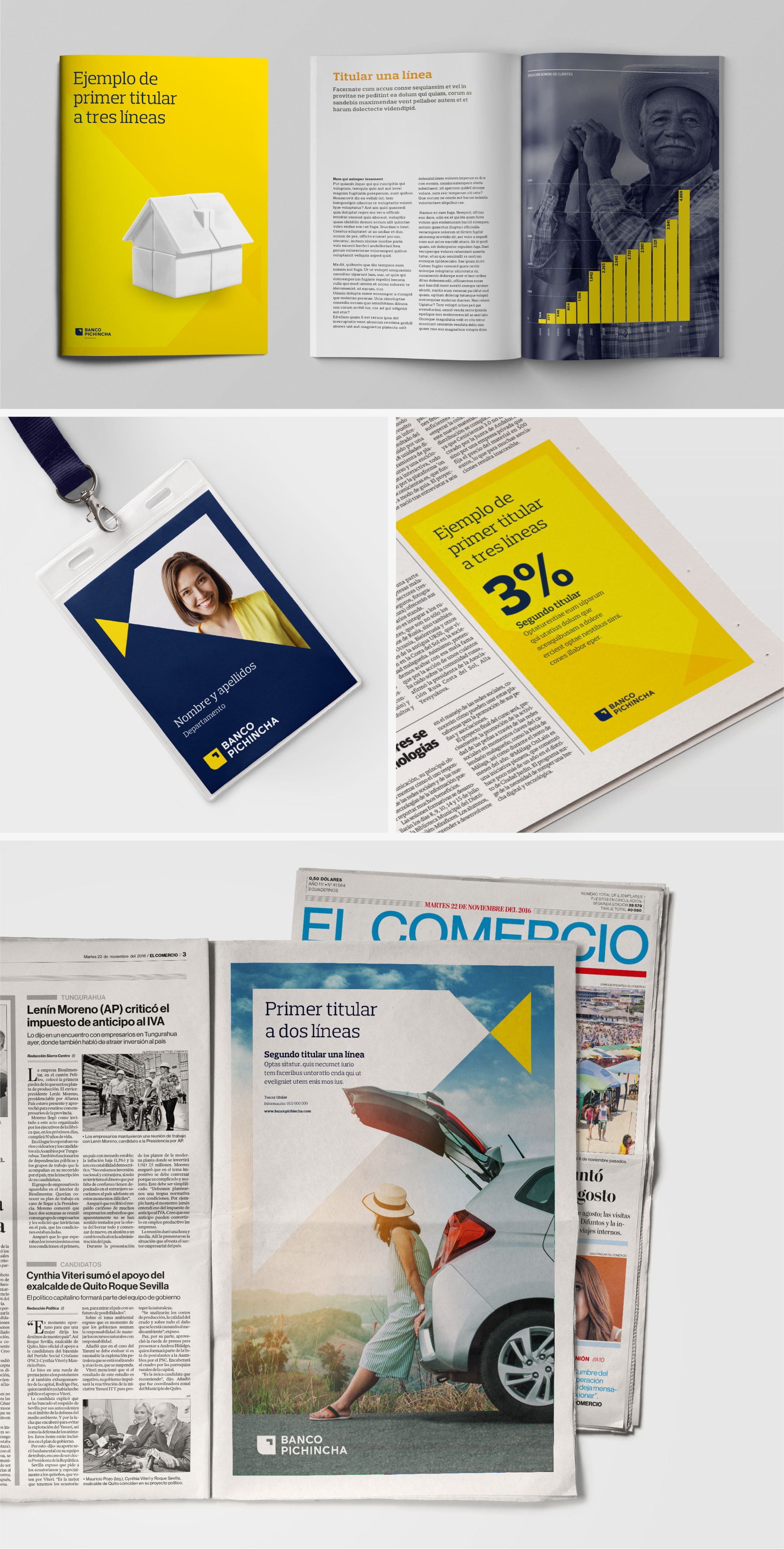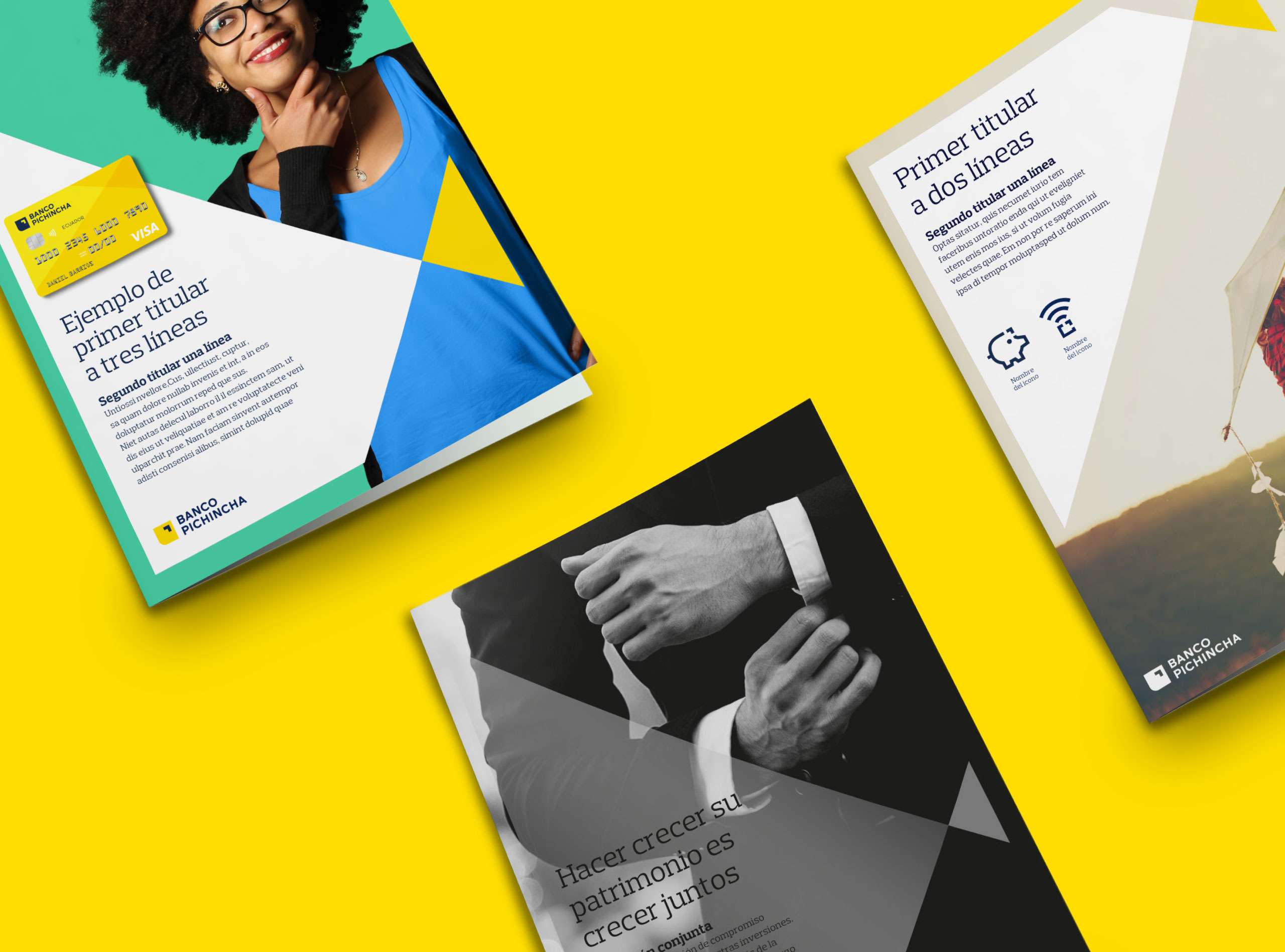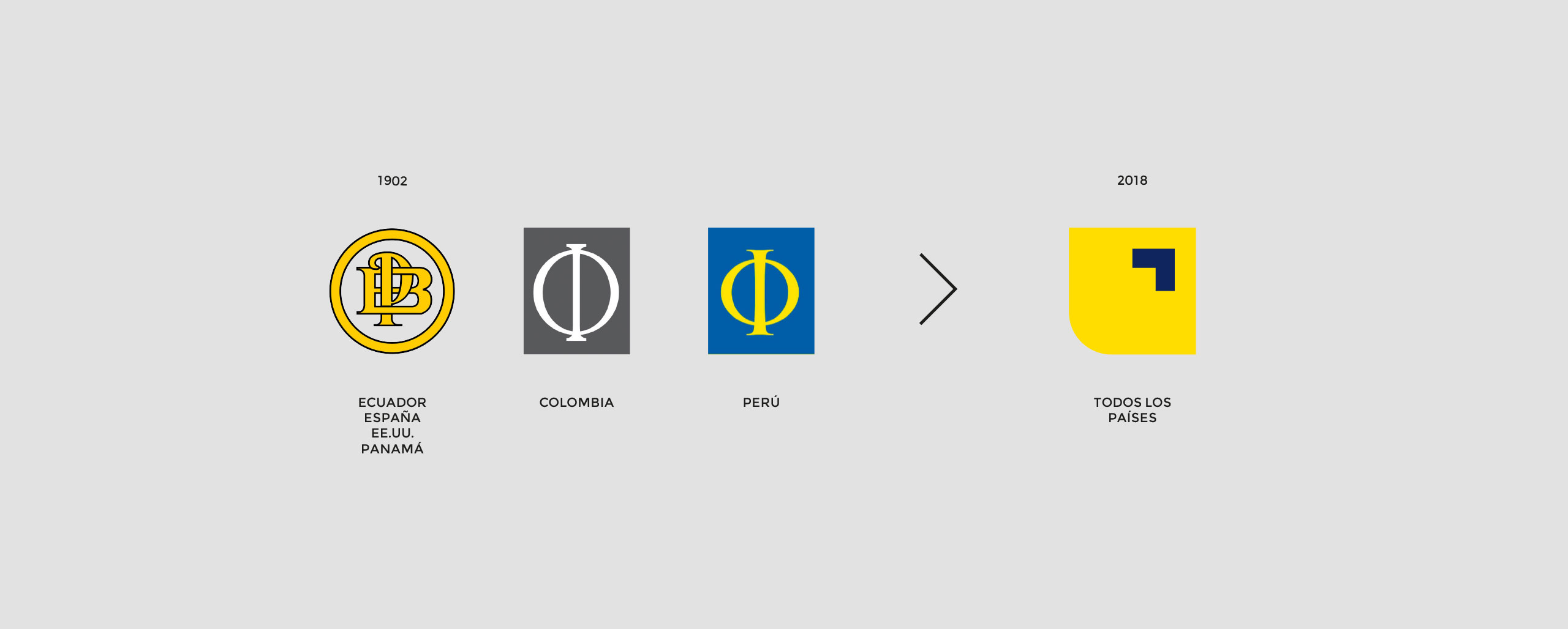 從一開始,直覺就表明,應(yīng)保留黃色作為銀行的主要顏色,以保留品牌的傳統(tǒng),也因?yàn)辄S色在該行業(yè)中差異很大。黃色也出現(xiàn)在安第斯地區(qū)的大多數(shù)國(guó)旗中,并具有積極的含義,象征著積極,幸福,光線(太陽(yáng)的光線垂直于赤道)和繁榮等。為了使品牌煥發(fā)活力,選擇了一種更明亮,更清新的黃色調(diào),并結(jié)合了高雅現(xiàn)代的海軍藍(lán)(厄瓜多爾國(guó)旗的新奇閃光)來(lái)替代黑色,而黑色與黃色形成了鮮明的對(duì)比。