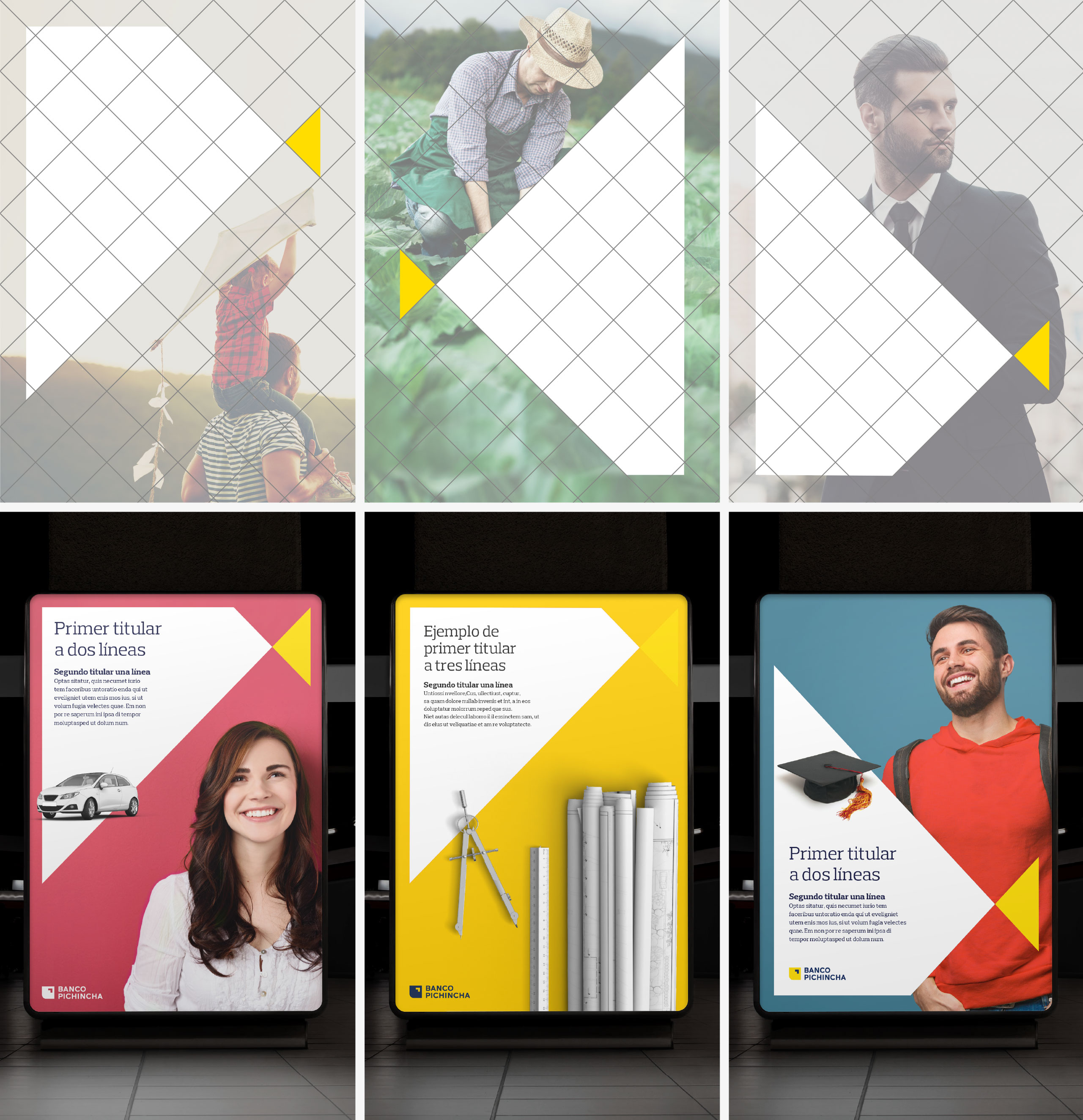 根據(jù)銀行的定位,創(chuàng)建了一個(gè)網(wǎng)格,盡管其圖形簡(jiǎn)單,但它象征著兩個(gè)相互面對(duì)的實(shí)體,在這種情況下,是銀行與客戶之間的真誠(chéng)關(guān)系。這種關(guān)系采用兩個(gè)三角形的形狀,它們?cè)谝粋€(gè)靈活的圖形系統(tǒng)中相遇并擴(kuò)展,該圖形系統(tǒng)適用于不同的平臺(tái)和格式,并充當(dāng)圖像和文本的容器。