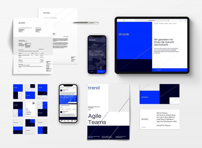 在使用中始終傾斜和動態的線元素象征性地代表趨勢線,因此是Drozak客戶的視覺成功代名詞。新開發的文字標記完全是小巧的,其特點是內斂的細節。具有人文主義細節的技術和建構主義設計。清晰,安全,優雅。