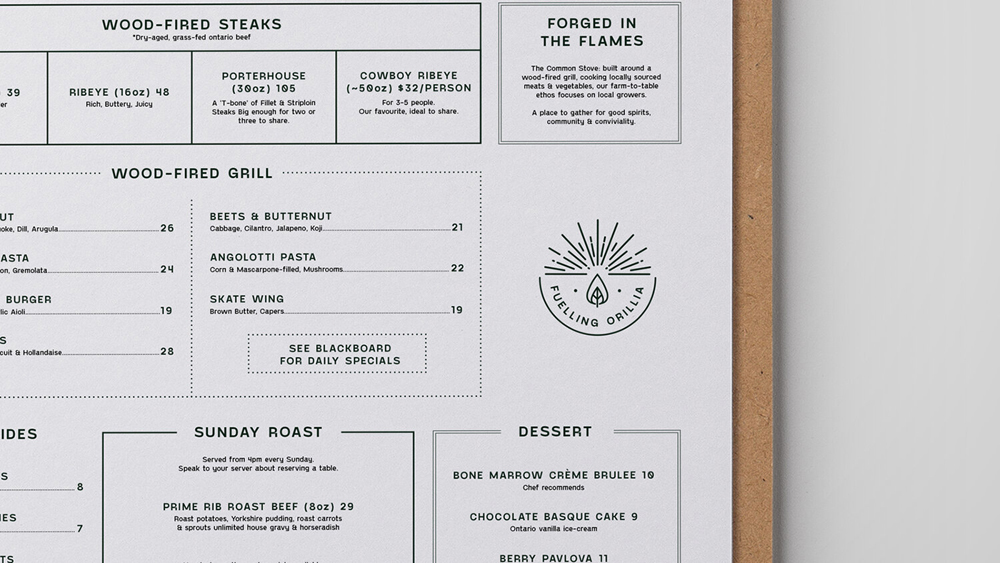 餐飲VI設計中的所使用的字體設計受到東歐和俄羅斯的啟發-巧妙地引用了The Common Stove的起源。標題被定制以反映多倫多地鐵的幾何無襯線細節。在菜單設計中,幾何形狀的使用得到了進一步的發展,讓人聯想起地鐵磚。