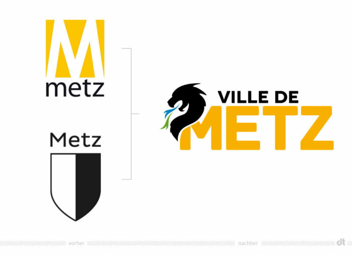 在新的四色城市標志中,黑色龍頭與“VILLE DE METZ”字樣相結合。龍頭坐在黃色的首字母“M”上,并噴出藍色和綠色的光芒,而不是火,這應該被理解為與水和自然相連的象征。