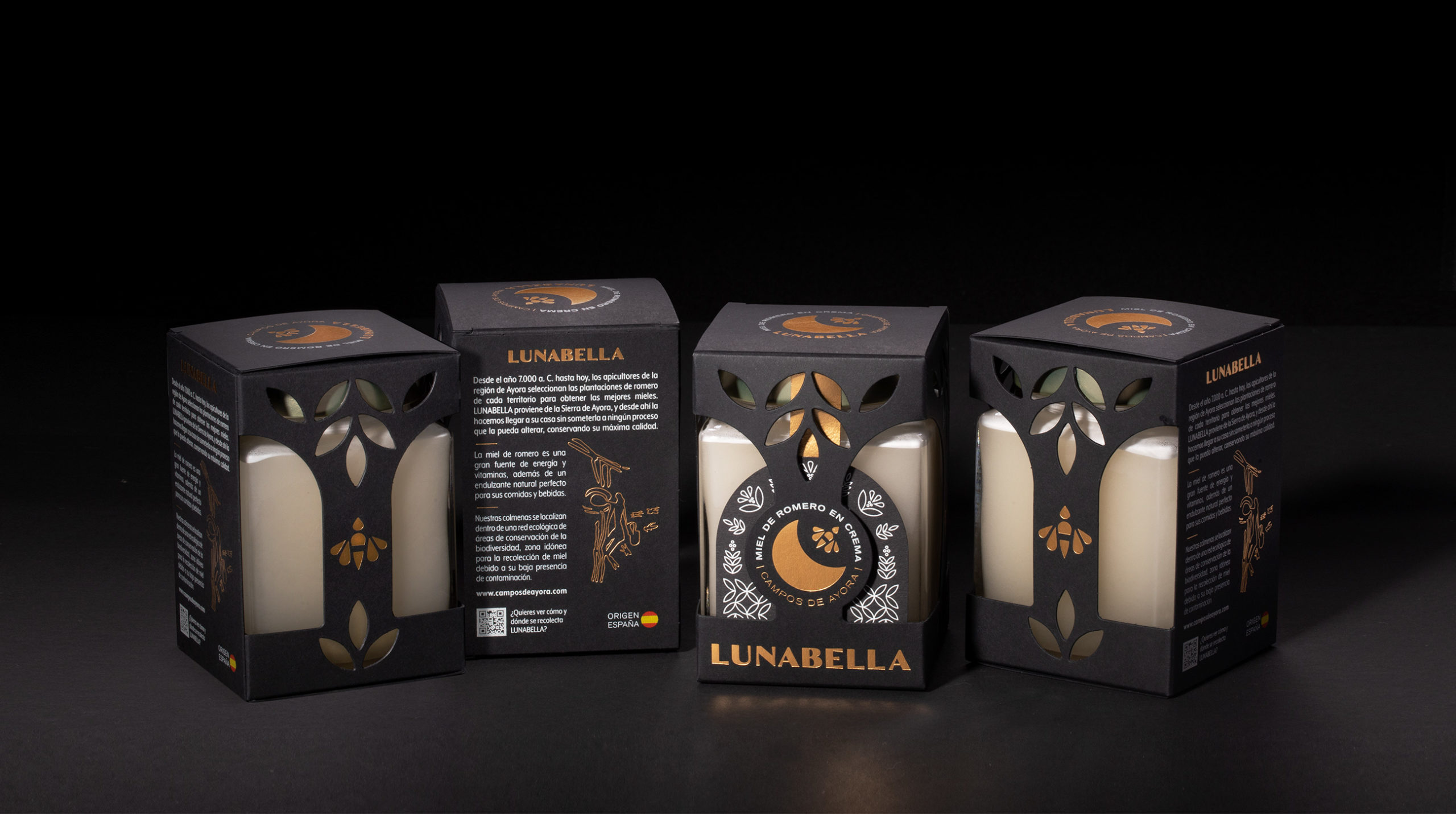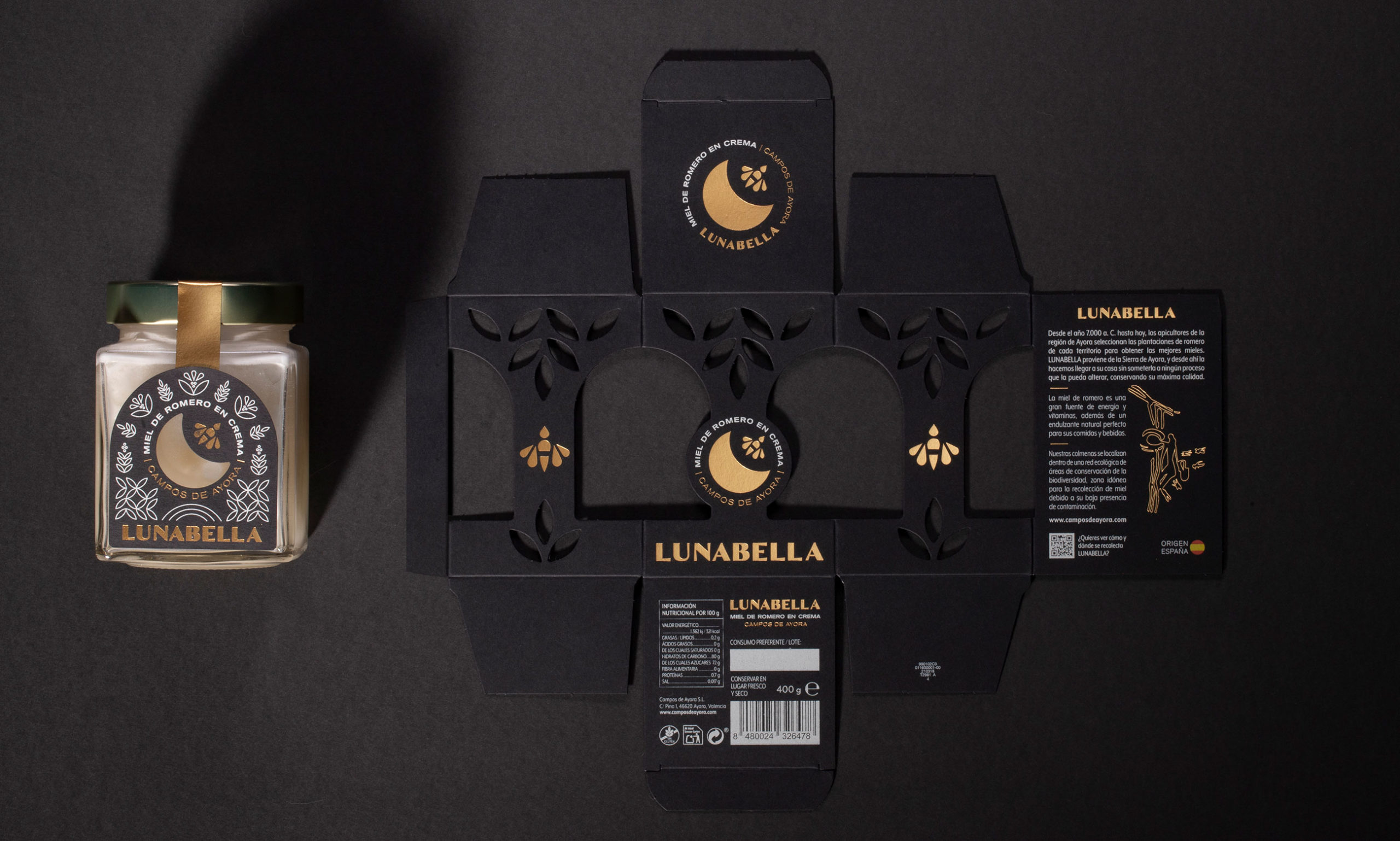 品牌設計、包裝和網站,Lunabell 是一種天然迷迭香蜂蜜,由 Campos de Ayora 自然創造,幾乎沒有加工,該公司在 Ayora 的蜜蜂產品領域擁有 20 多年的經驗,幾個世紀前,西班牙的一個地區本應成為蜂蜜生產的先驅。