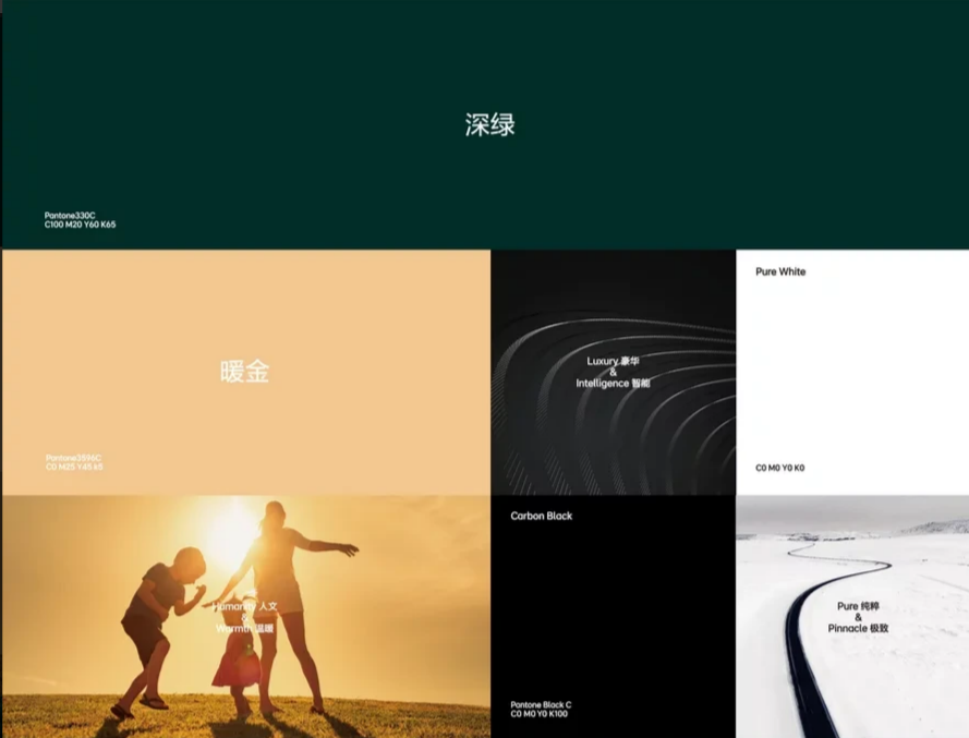 關(guān)于“家”的色彩體系,從行業(yè)標(biāo)準(zhǔn)中代表高科技感的金屬色和冷色系中脫穎而出,理想汽車的色彩體系旨在向用戶傳遞“幸福感” 和“向往感”。充滿生命力的“深綠”色,象征著廣闊深遠(yuǎn)的自然和向往自由的遠(yuǎn)方,是代表“移動(dòng)的家”的顏色。暖金色是定格時(shí)光的顏色,晨光暮靄,美好的時(shí)光總是與泛著金色的暖光相伴,傳遞家的幸福感。“深綠”與“暖金”一冷一暖、一深一淺,共同構(gòu)建“家”的色彩體系,用可視化的方式傳達(dá)“創(chuàng)造幸福的家,創(chuàng)造移動(dòng)的家”的品牌使命。