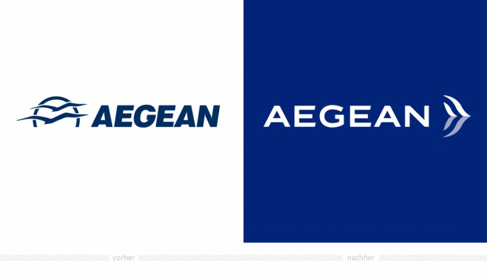 完全重新設計的徽標,變化的藍色陰影和飛機油漆方案,其中藍色陰影從垂直尾部延伸到機器機身-這些是愛琴海全新視覺形象的核心支柱。字母被改寫,以前的斜體,相對較窄的字母被較寬的字母代替。保留大寫字母的拼寫。象征性的標記被簡化,其基本圖案-兩只鳥-被重新解釋。