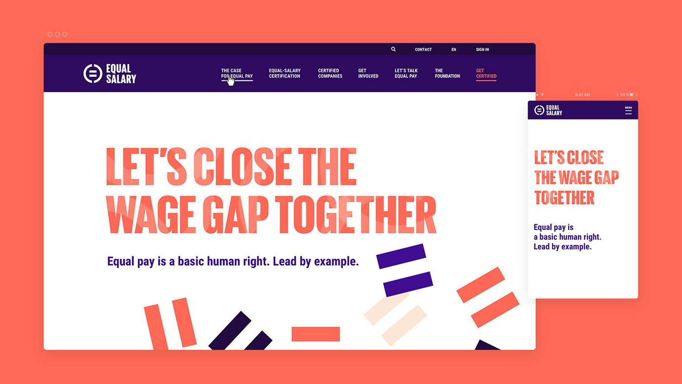 VI形象設計中,色彩采用藍色和珊瑚色,藍色和珊瑚色方案喚起了采取行動和同酬方法的嚴肅性,同時也反映了基金會在其認證過程中倡導的性別平等。排版讓人聯想到抗議海報,只不過圖片的使用已經被引文所取代,這些引語能激發人們的思考,并呼吁觀眾采取行動。