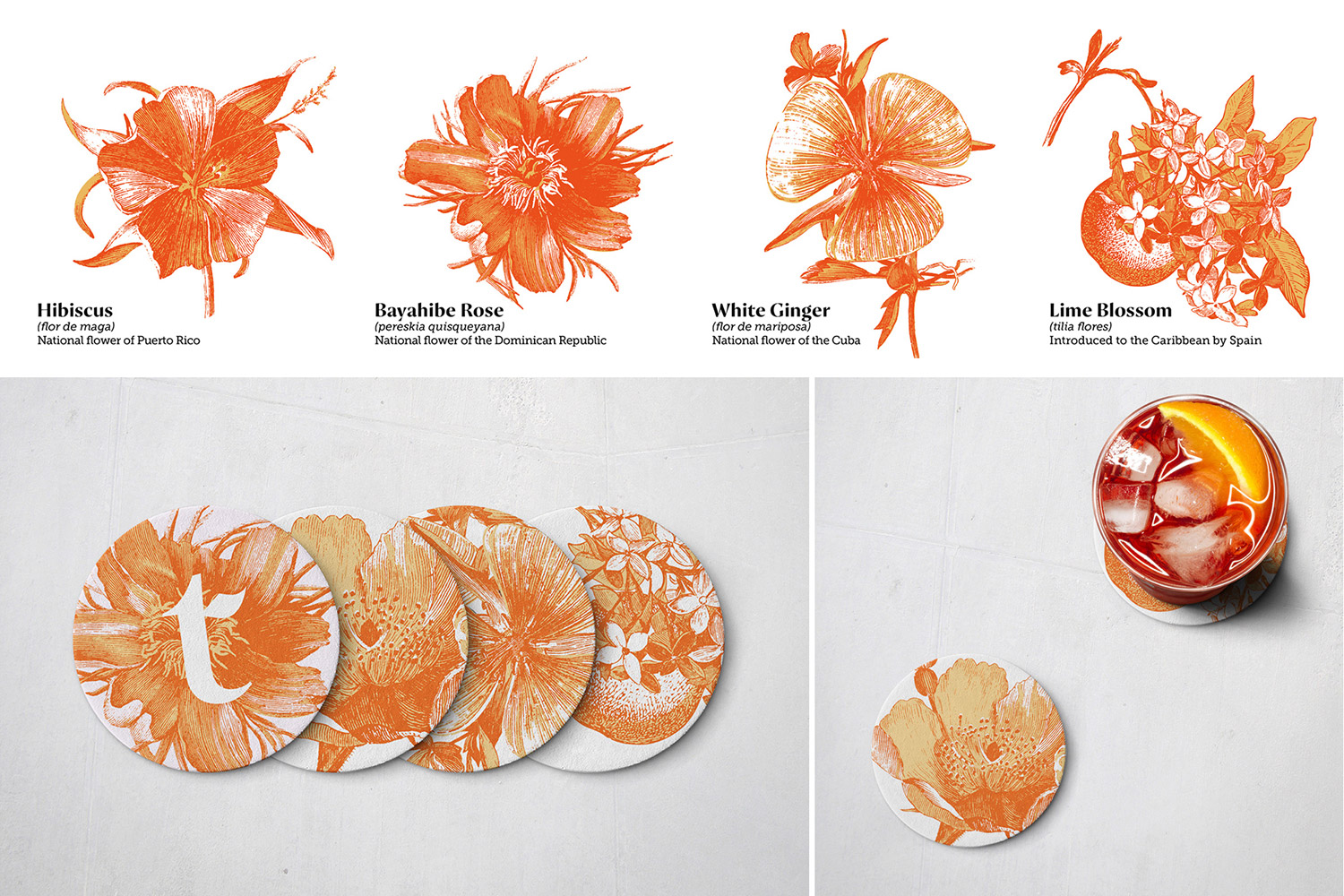 餐飲行業(yè)VI形象設(shè)計(jì)中探索波多黎各,多米尼加共和國(guó)和古巴的島嶼,嘗試尋找可以象征每個(gè)島嶼的獨(dú)特事物,并將它們與西班牙和塔伊諾州的歷史聯(lián)系起來(lái)。考察豐富的植物多樣性后,發(fā)現(xiàn)每個(gè)國(guó)家都有自己的國(guó)花,也是一個(gè)重要事實(shí),西班牙航海者將石灰引入加勒比海。