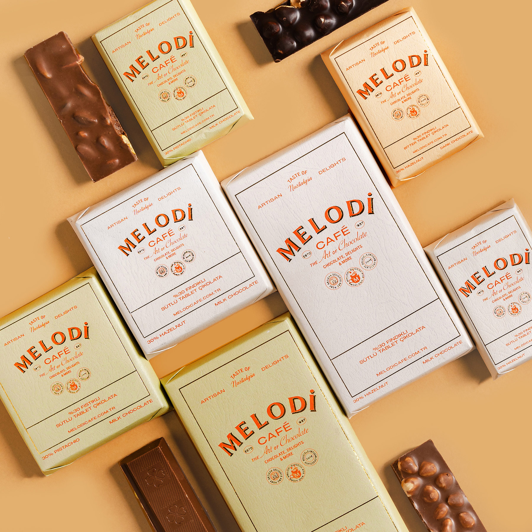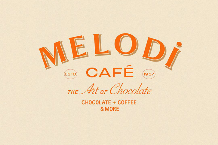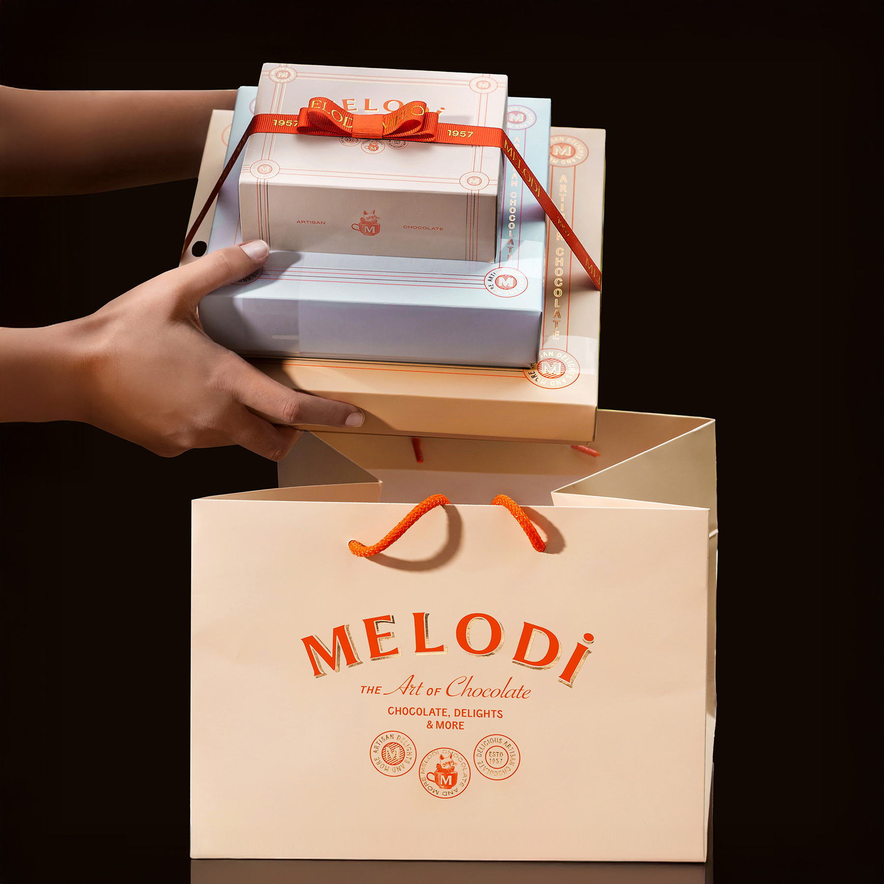 品牌設計的每一個細節都經過精心設計,旨在喚起溫暖、魅力和一絲復古優雅的氣息。柔和的色調、經典的字體搭配鮮艷的橙色點綴,為視覺形象注入活力。金箔細節增添了奢華精致的氣息,而飾有精美圖案和高品質飾面的包裝,則讓每一次購買都如同一份特別的禮物。從咖啡館外觀的第一眼,到最終打開巧克力禮盒的那一刻,MelodiCafé都是一種對藝術、品味和永恒愉悅的頌揚。