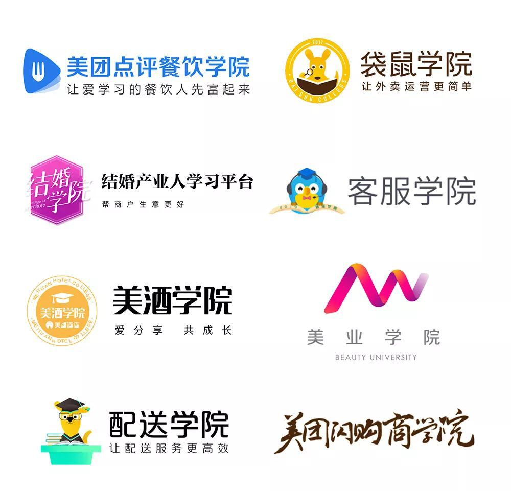美團大學設有八大學院,涵蓋餐飲、外賣、美業、酒旅等多個生活服務品類,而且每個學院分別擁有自己獨立的品牌logo設計。