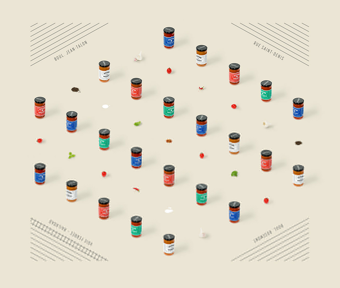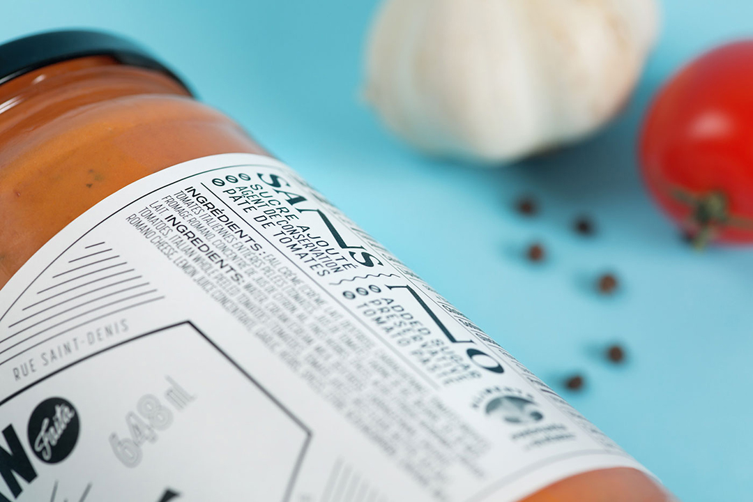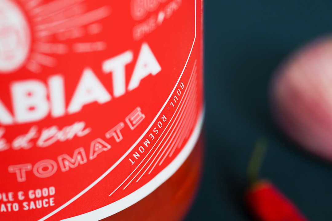 這種對細節的關注在標簽圖形布局中得到了體現,該布局是圍繞一個多邊形展開的,該多邊形代表了蒙特勒阿爾小意大利的地理范圍,并在每種醬汁特有的排版處理中得到了體現。營養和法律信息以不尋常的垂直方式呈現在形狀之外。