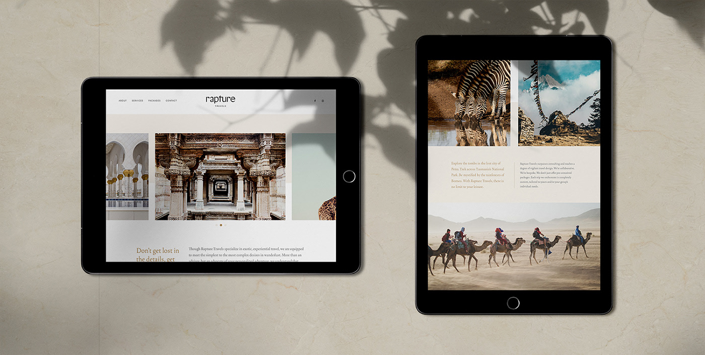 Rapture Travels專業(yè)從事異國情調(diào)的體驗式旅行社VI設計。該公司強調(diào)在迷失的佩特拉市探索墓葬,穿越塔斯馬尼亞國家公園,以及在婆羅洲的雨林中漫步。有了Rapture Travels,休閑就不受限制。