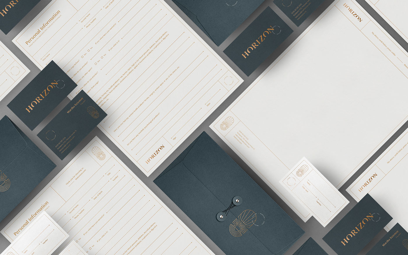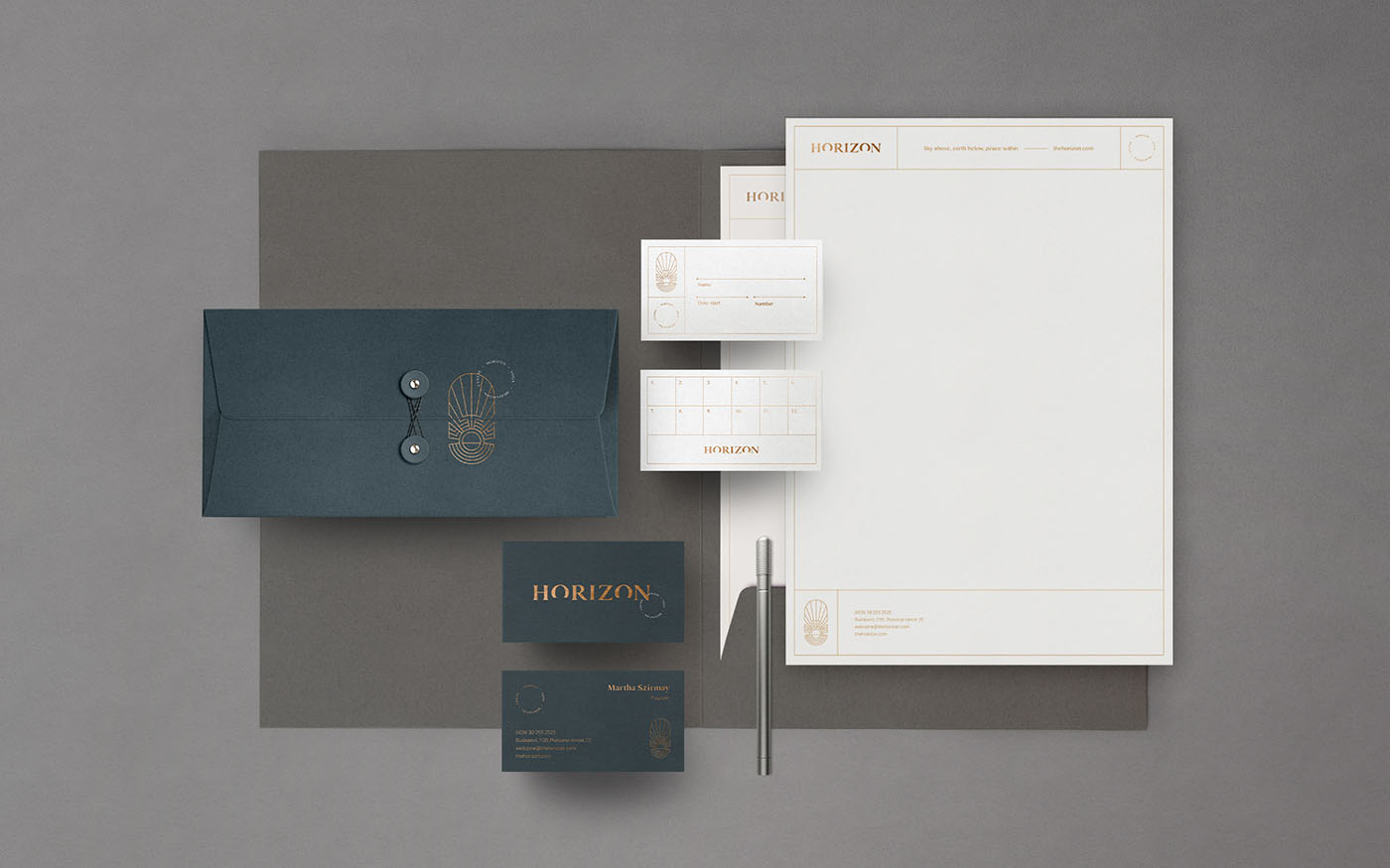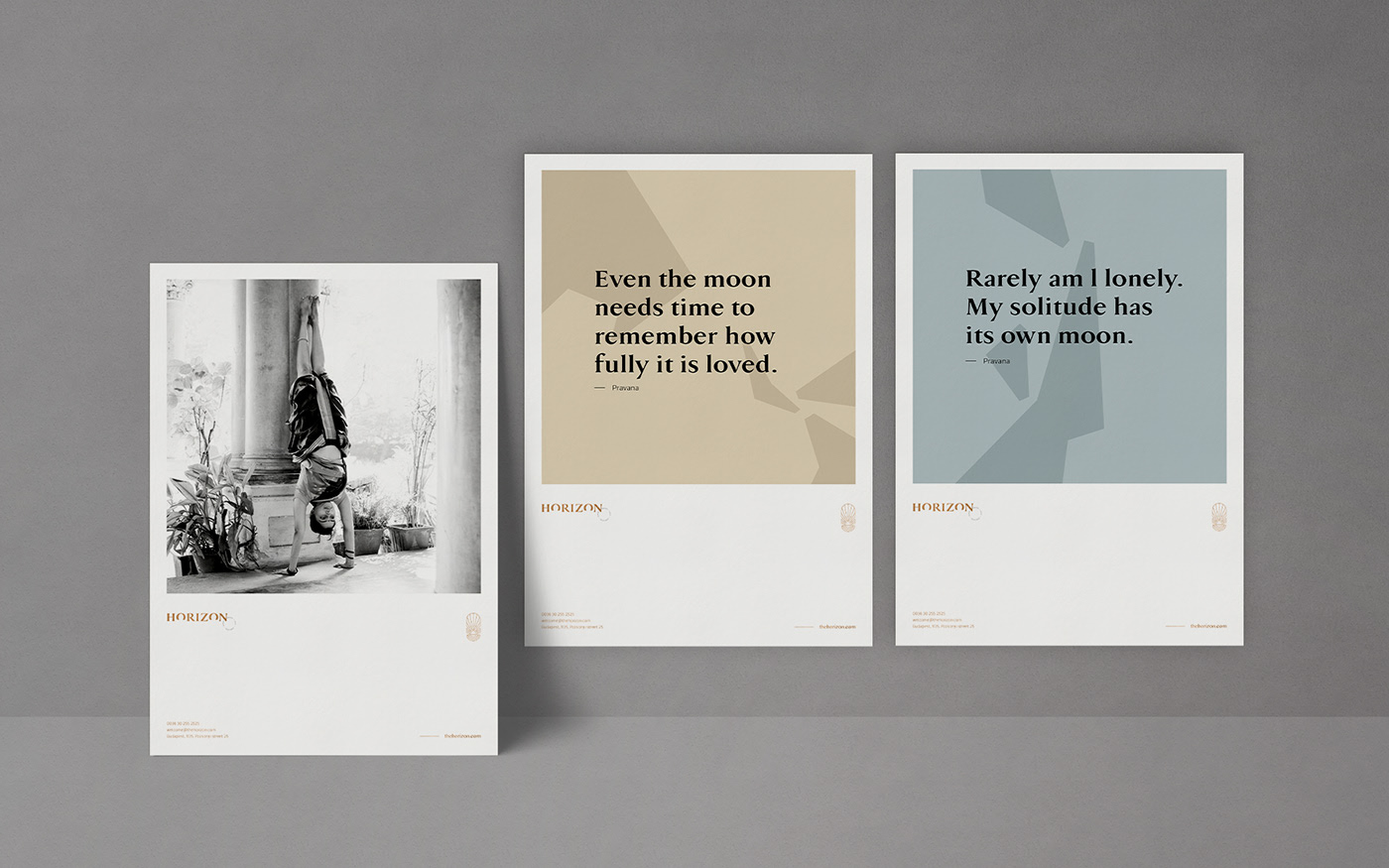 Horizon瑜伽工作室品牌設計, 首先,“內部地平線”這個名稱,它象征著人類靈魂和身體固有的心理和外部身體成長。 古老的印度古跡碎片化的大理石覆蓋物和郁郁蔥蔥的蔬菜環境為我帶來了靈感。 這導致了主要的深綠色,次要的低飽和度彩色色調和古樸典雅的字體。 我想為這個品牌打造干凈卻讓人聯想到的視覺外觀。