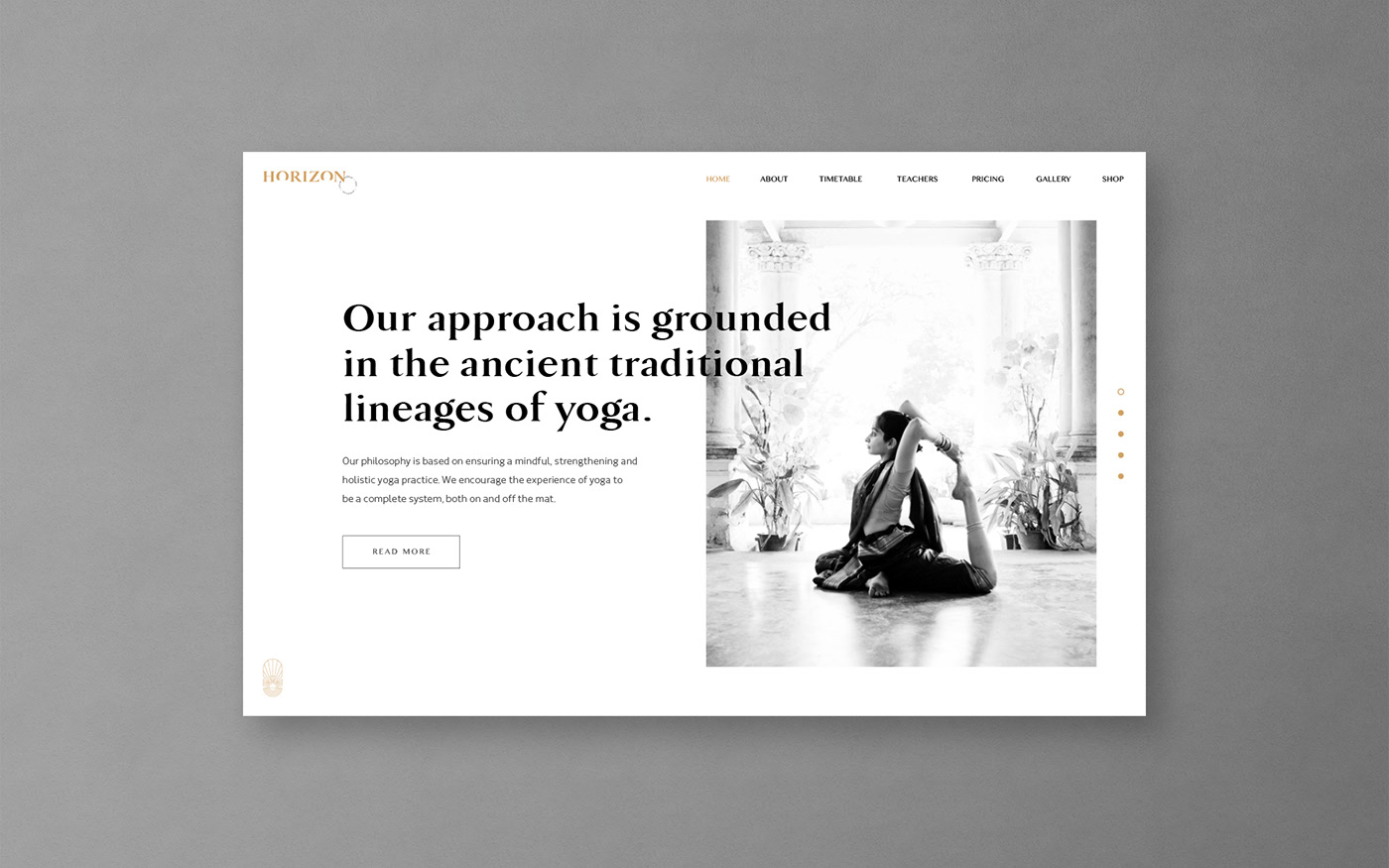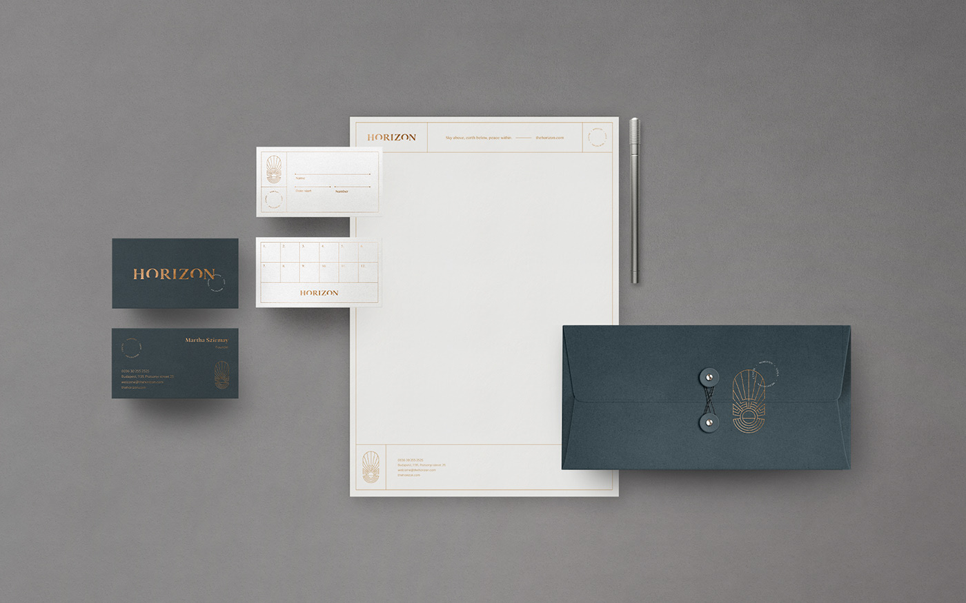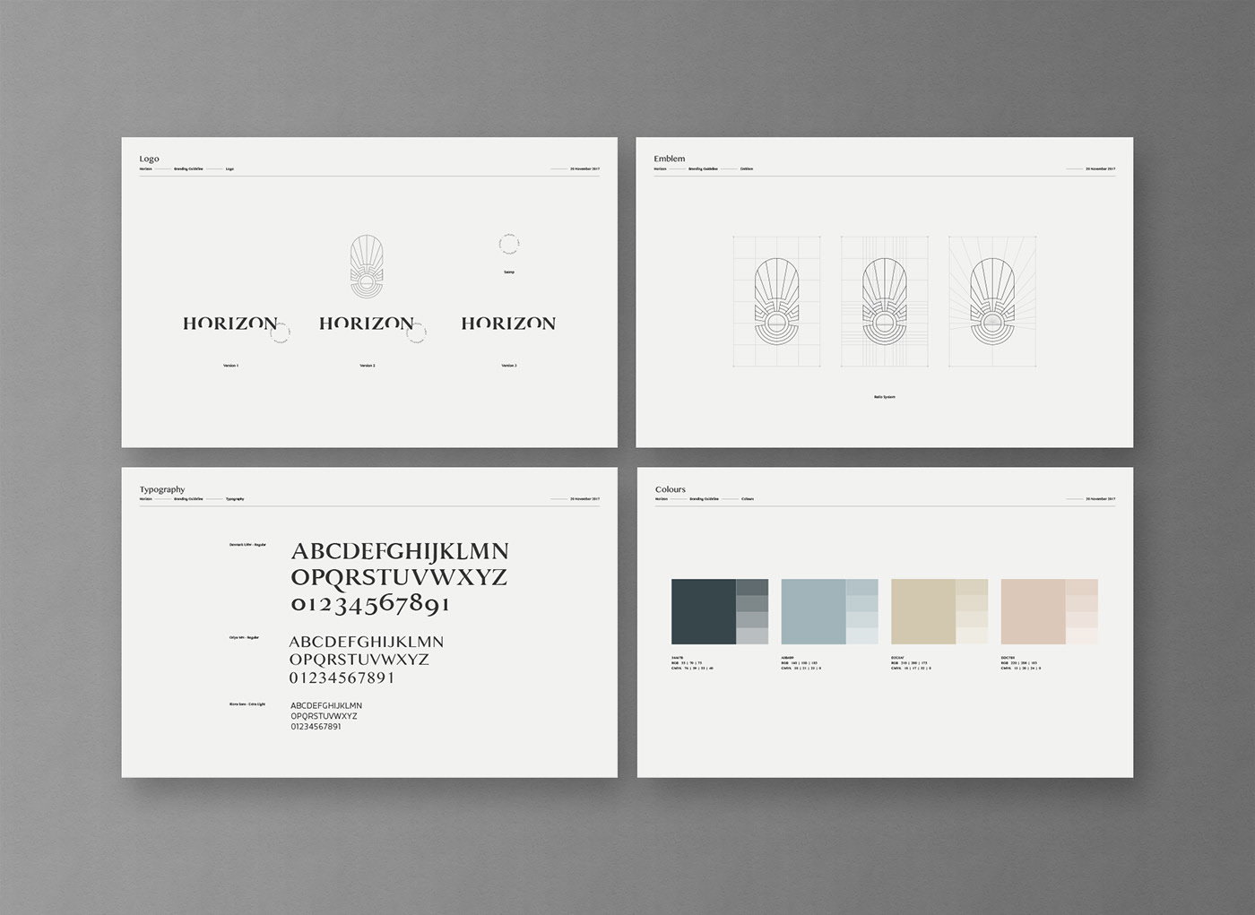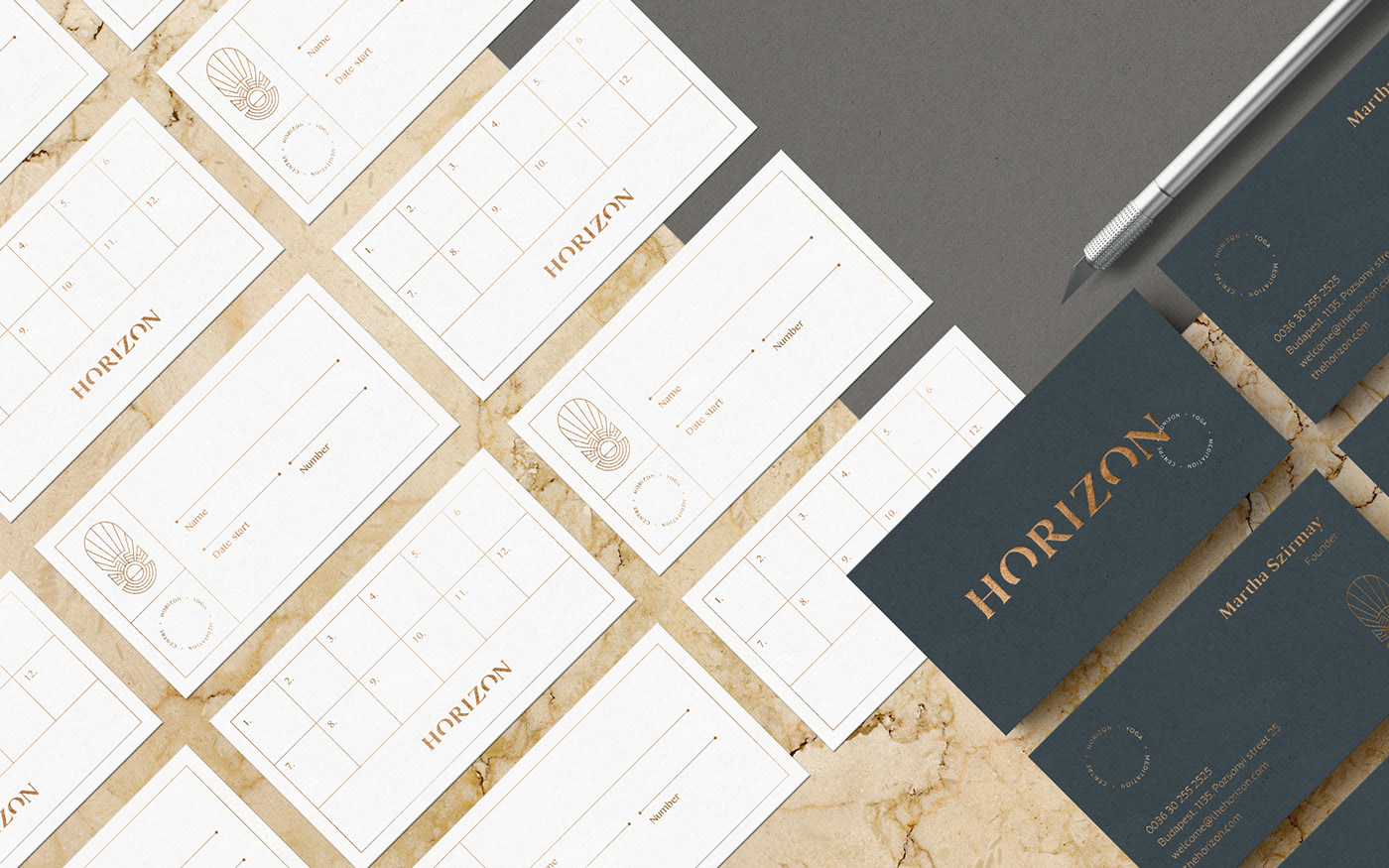 Horizon瑜伽工作室品牌設計, 首先,“內部地平線”這個名稱,它象征著人類靈魂和身體固有的心理和外部身體成長。 古老的印度古跡碎片化的大理石覆蓋物和郁郁蔥蔥的蔬菜環境為我帶來了靈感。 這導致了主要的深綠色,次要的低飽和度彩色色調和古樸典雅的字體。 我想為這個品牌打造干凈卻讓人聯想到的視覺外觀。