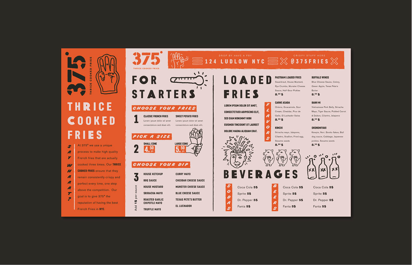 直到現(xiàn)在,炸薯?xiàng)l通常只煮兩次。 完美薯?xiàng)l的375度秘訣是將它們煮三次,并用招牌澆頭裝滿。 由于炸薯?xiàng)l是主要食品,尤其是在紐約這樣的地方,該市的炸薯?xiàng)l比例相當(dāng)高,因此需要375度才能脫穎而出。 在這里,薯?xiàng)l肯定提高了一個(gè)檔次,因此我們也想在品牌推廣上做同樣的事情。