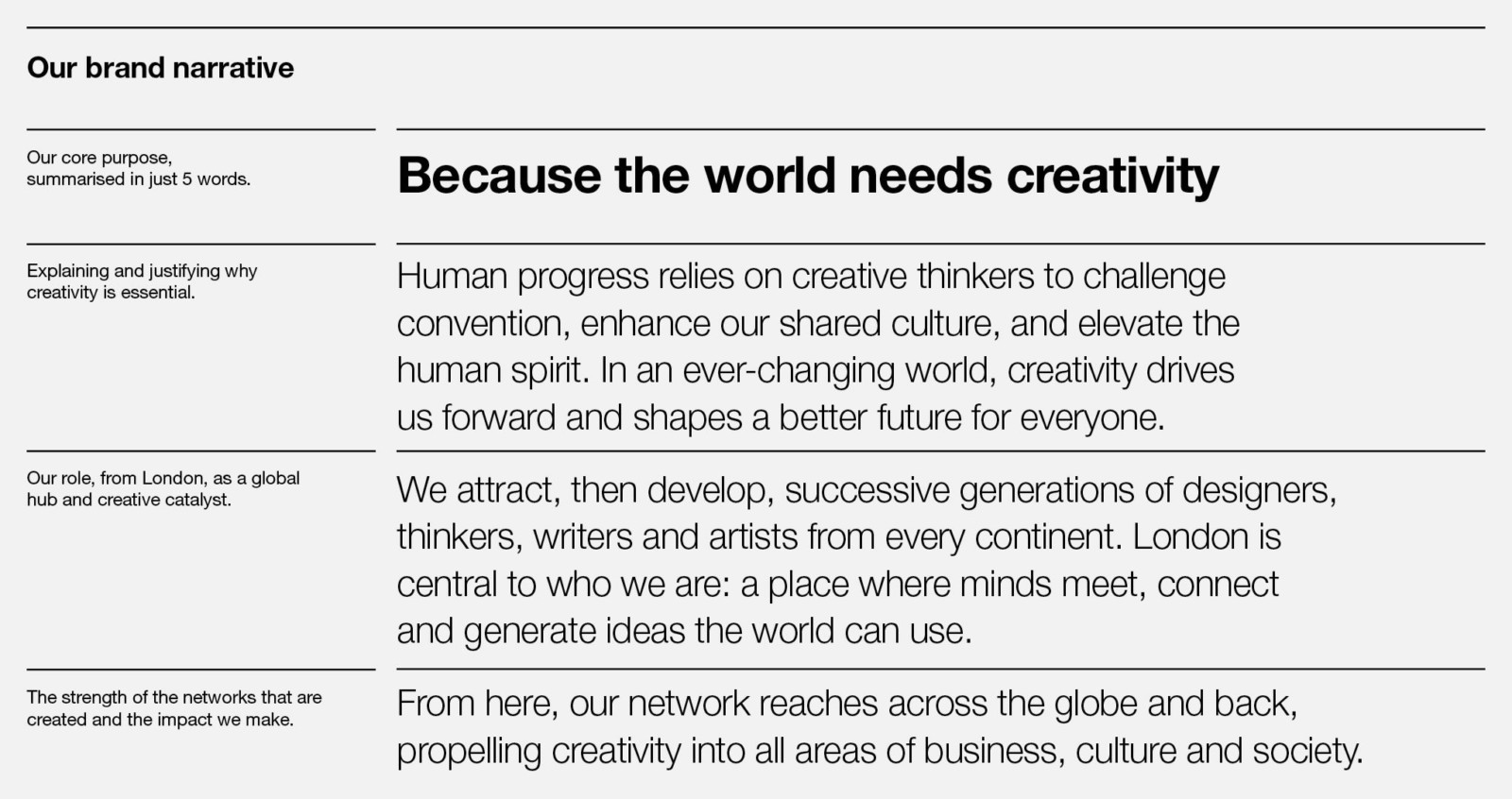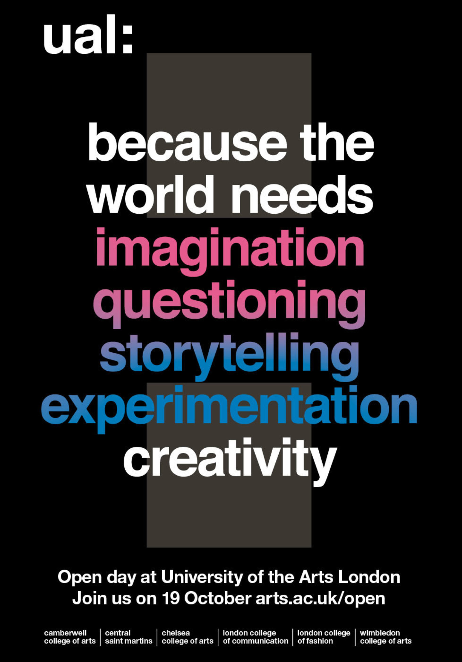隨后,我們舉辦了多個(gè)品牌VI設(shè)計(jì)研討會(huì),以解決UAL的核心目的,我們力圖在概念上將其與主要的全球競(jìng)爭(zhēng)對(duì)手區(qū)分開。沒有一所藝術(shù)大學(xué)在解決我們似乎存在的明顯差距,即憑自己的能力為創(chuàng)造力辯護(hù),并展示創(chuàng)造力如何為每個(gè)人塑造更美好的未來(lái)。因此,我們開始起草品牌故事,直接回答“我們?yōu)槭裁丛谶@里?”這一問(wèn)題。–答案很快就變得很明確:“ 因?yàn)槭澜缧枰獎(jiǎng)?chuàng)造力 ”。與此同時(shí),我們對(duì)UAL的宗旨進(jìn)行了強(qiáng)有力的宣稱,我們起草并同意了言語(yǔ)基礎(chǔ),這些基礎(chǔ)為現(xiàn)在在整個(gè)大學(xué)及其學(xué)院中推出的內(nèi)容框架提供了信息。