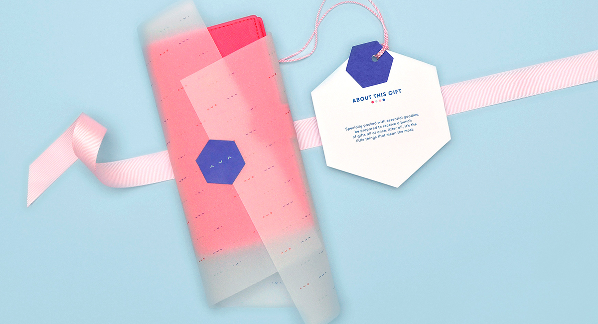 在整個應用程序中使用印刷術可支持品牌的實驗精神。包裝周圍的短語顯示出精確度和類似于化學公式的符號。這些元素與由鍵盤符號組成的笑臉相結合,帶來了俏皮的實驗室美學。 Davana選擇了傳統的藍色和粉紅色作為調色板,以參考該品牌同時具有男女禮品盒的事實。添加了紅色和淺綠色作為對比色,并在該品牌VI形象設計中所有附帶材料中使用。