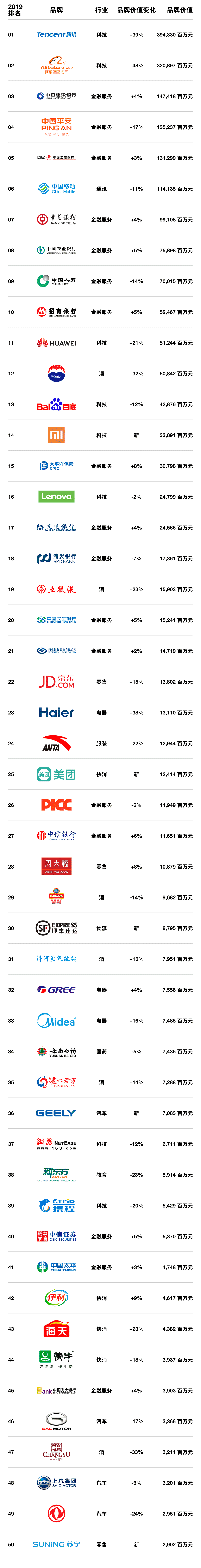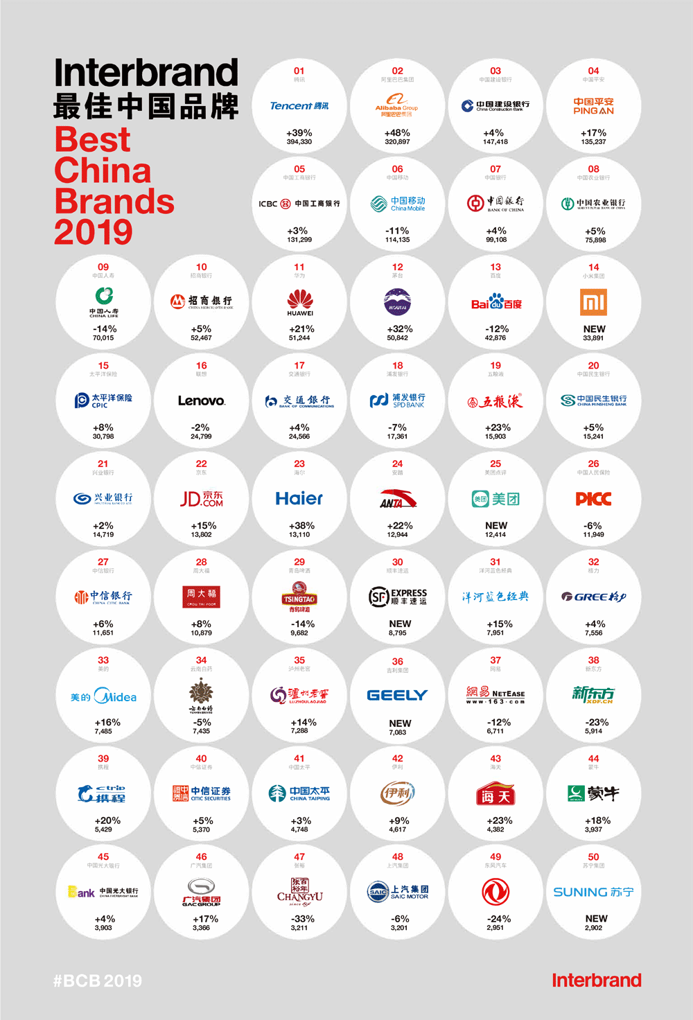 品牌咨詢公司Interbrand30日發布了2019年度的中國最佳品牌排行榜,相比去年中國品牌的價值均大幅度提升,前50強整體增長了15%。今年是Interbrand第十二次針對中國市場發布排行榜,其對品牌價值的評估主要通過以下三個關鍵維度: 品牌化產品和服務的財務業績、購買決策過程中的品牌作用力、品牌所擁有的貢獻于未來收益的品牌強度。 騰訊、阿里巴巴、中國建設銀行繼續穩居前三甲。中國平安從第六來到第四,中國移動、中國工商銀行分別下滑至第六、第五。榜單前十名大多是傳統金融機構。除上述企業外,榜單第7名至第10名依次為中國銀行、農業銀行、中國人壽及招商銀行。