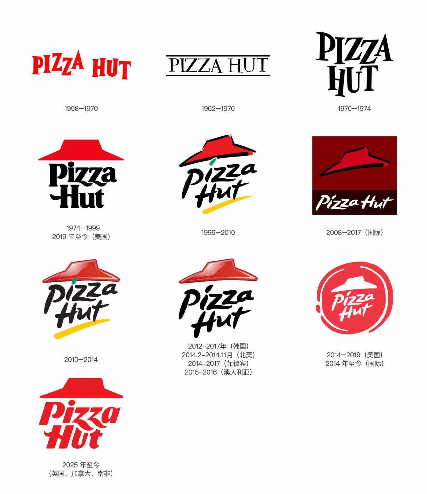 回顧必勝客品牌LOGO設計的演變歷程,1974年紅色屋頂首次亮相,成為品牌的標志性元素;1999年紅帽邊緣更加鋒利,文字帶有手寫感且用黃色強調;2014年推出極簡風格,以紅色圓餅為背景;2019年美國市場回歸1974年的紅帽黑字組合。此次2025年的新標在保留經典紅色屋頂的基礎上融入了新創意,既延續了品牌的識別度,又增添了時代感,是適應市場變化和品牌發展的一次重要品牌LOGO設計調整。