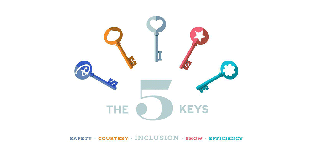 一直以來,迪士尼樂園的演職人員必須遵循四個關鍵要素(也稱之為「四把鑰匙」),即安全(Safety),禮貌(Courtesy),表演(Show)和效率(Efficiency)。六十多年來,這四個關鍵要素為迪士尼的文化奠定了基礎,因為他們認為,吸引游客多次來到迪士尼樂園游玩的點不是一個又一個夢幻的卡通人物或者現有的設施,而是優質的服務。
