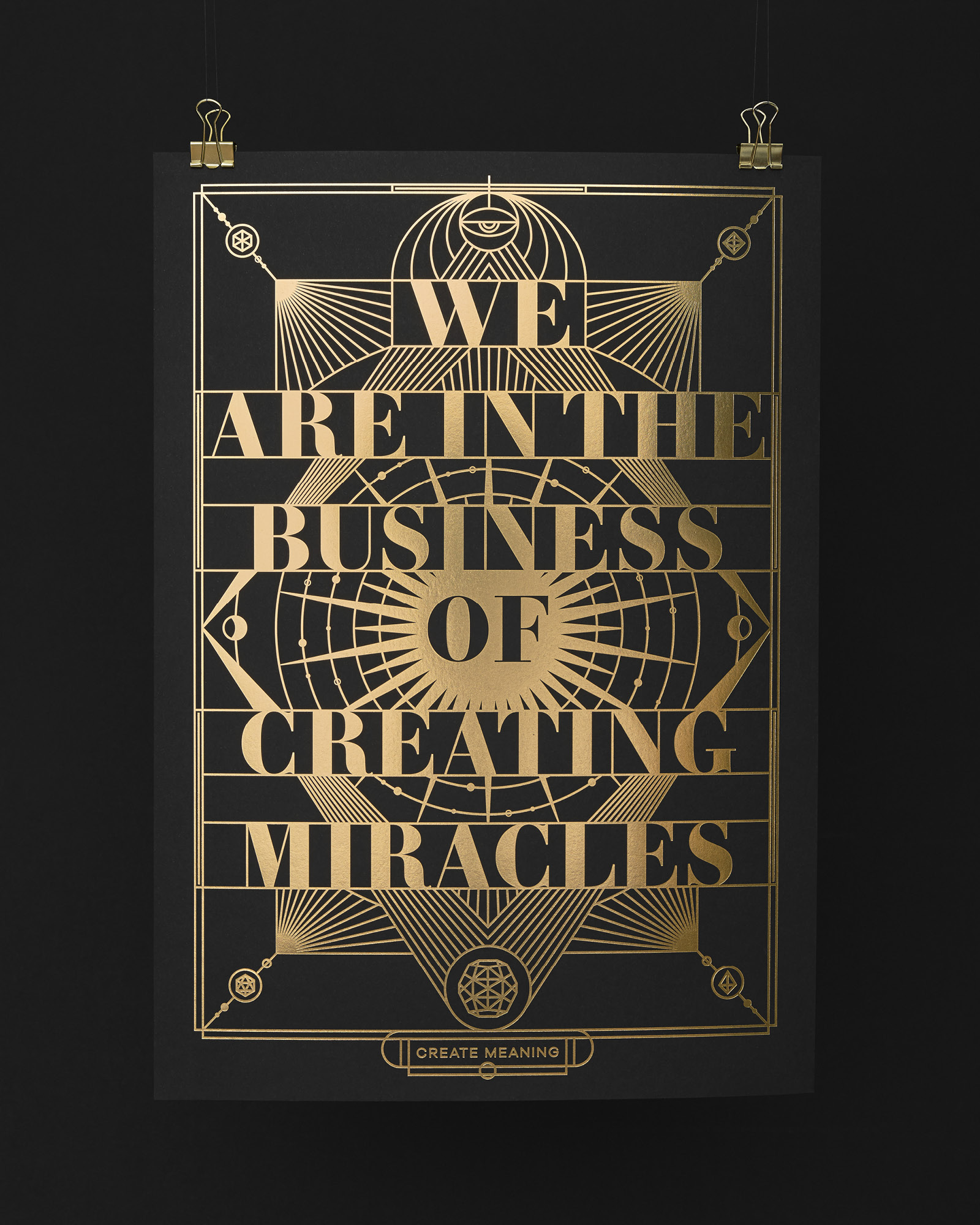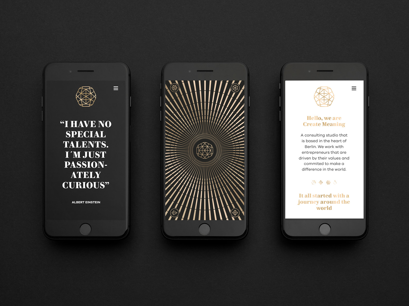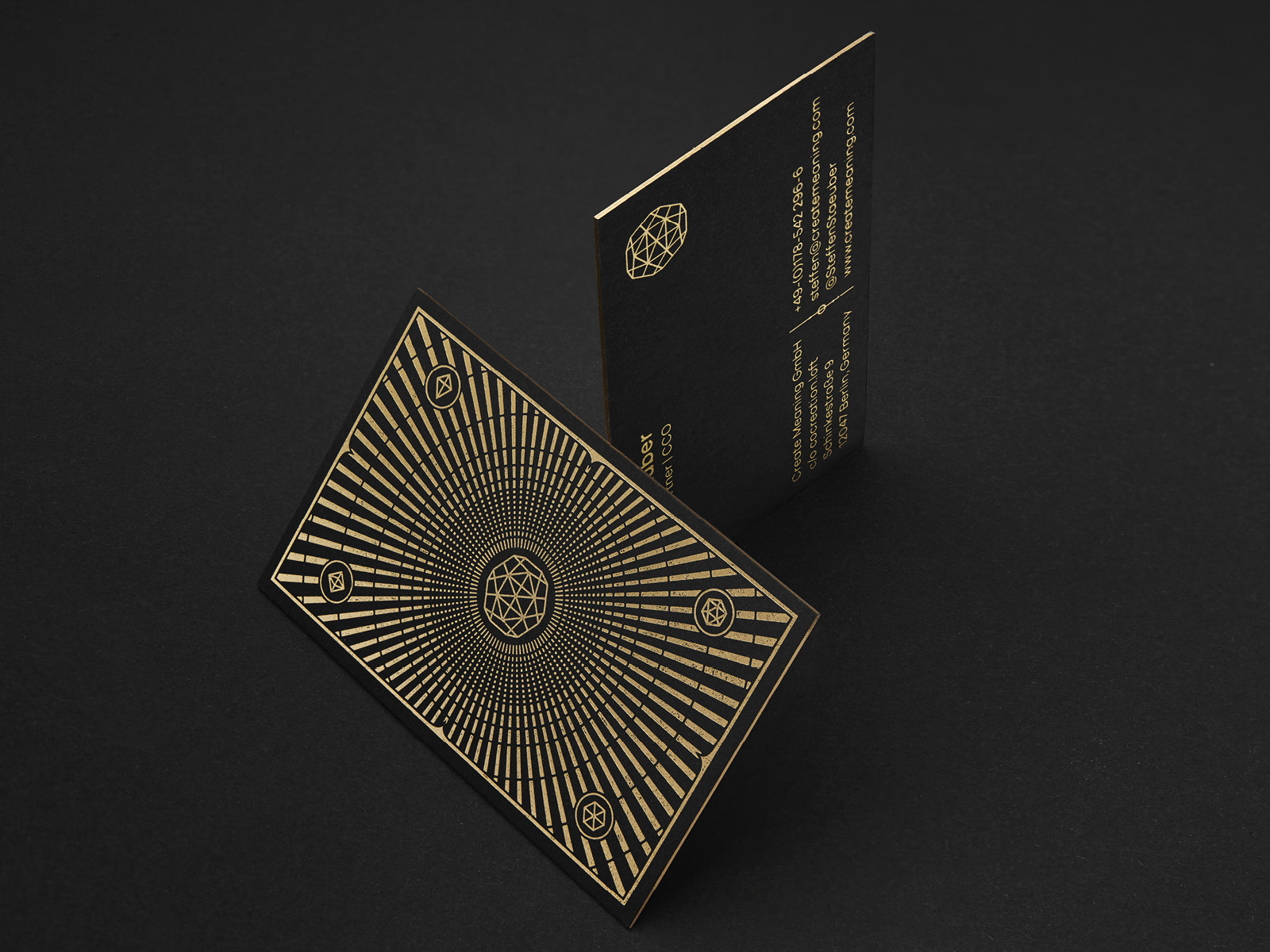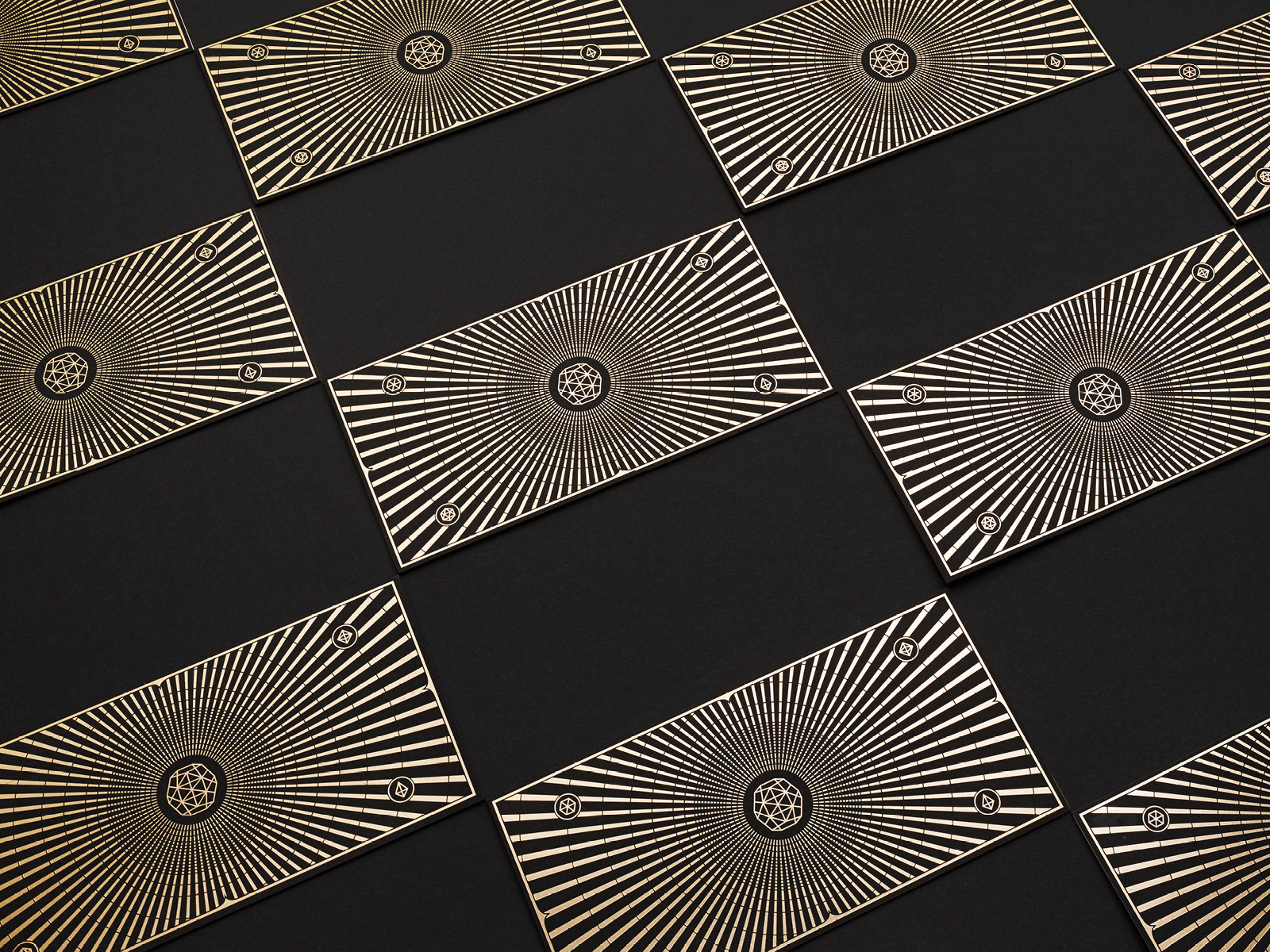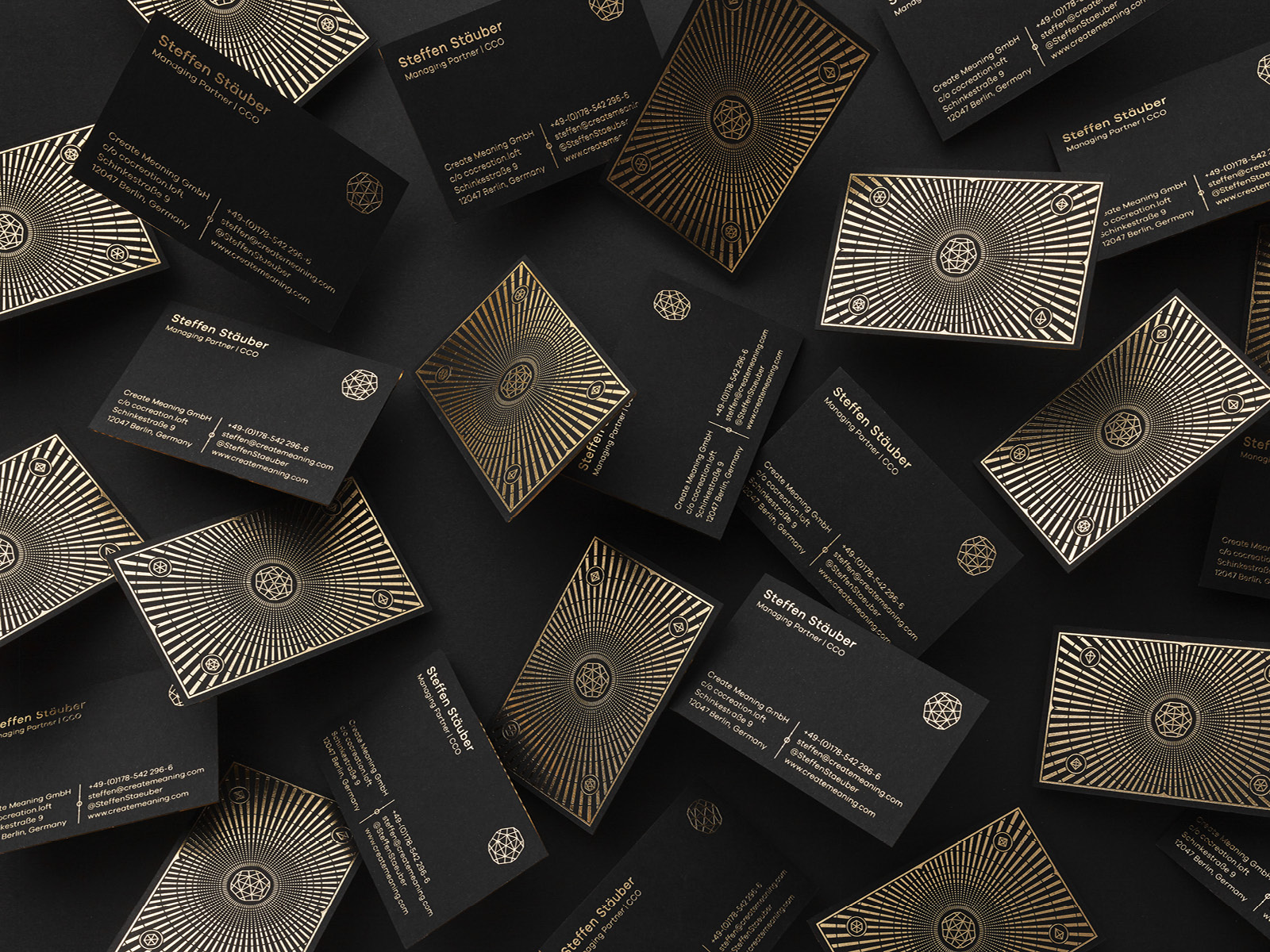 “創建含義”徽標是一個十二面體,其十二個表面象征著企業家決策的多維性,同時也代表了其影響的復雜性。咨詢公司的工作是科學與神秘主義的結合,這在家公司VI設計中很明顯,并以特殊的方式說明了創始人的高質量和質量標準。金色代表太陽,黑色代表宇宙。特殊的還有精加工形式,例如金色熱箔壓印,
