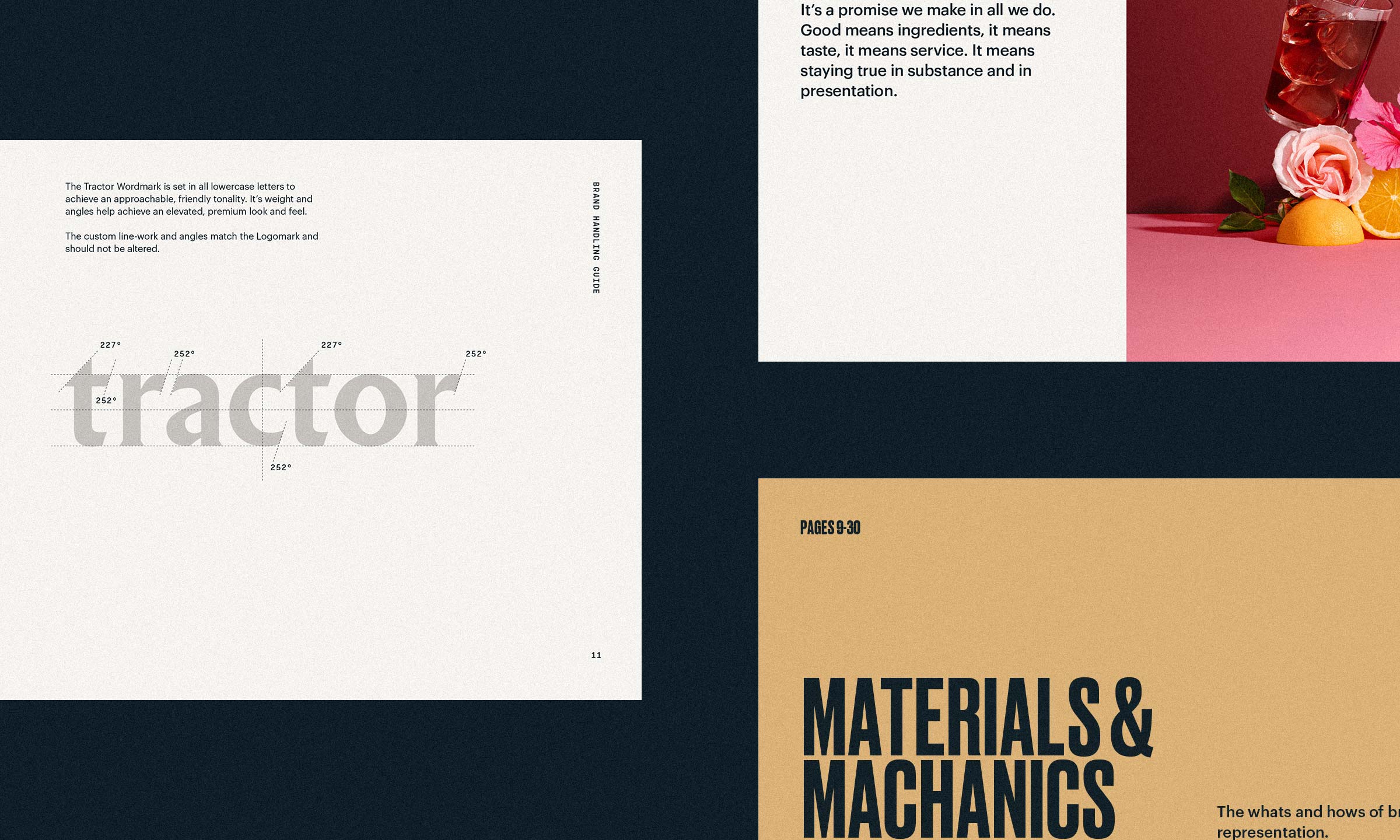 在開發(fā)拖拉機的視覺系統(tǒng)時,我們尋求設計一個持久的、靈活的設計系統(tǒng),它傳遞著一種對傳統(tǒng)的認可,傳遞著一種優(yōu)質的體驗。我們努力實現(xiàn)一種平衡,感覺簡單但崇高,容易接近,但不太可愛,同時建立一個大膽的存在,總是有吸引力的。故意剝去絨毛和傳達透明度是有意的,以表明什么是最重要的-成分。以干凈的線條,強大的類型和無懈可擊的攝影,我們發(fā)現(xiàn)了一種視覺語言,與拖拉機的觀眾共鳴,誠實地反映了這個品牌獨特的特點的更深的方面。
