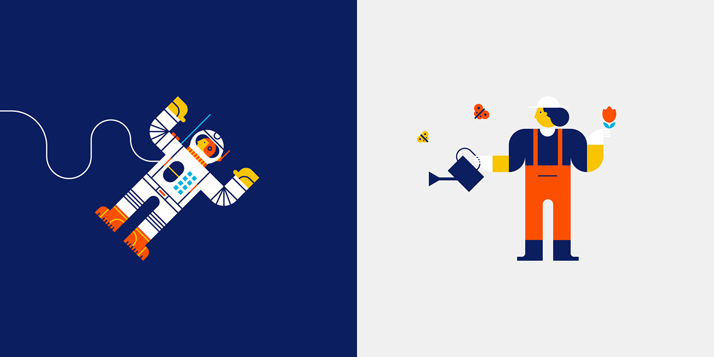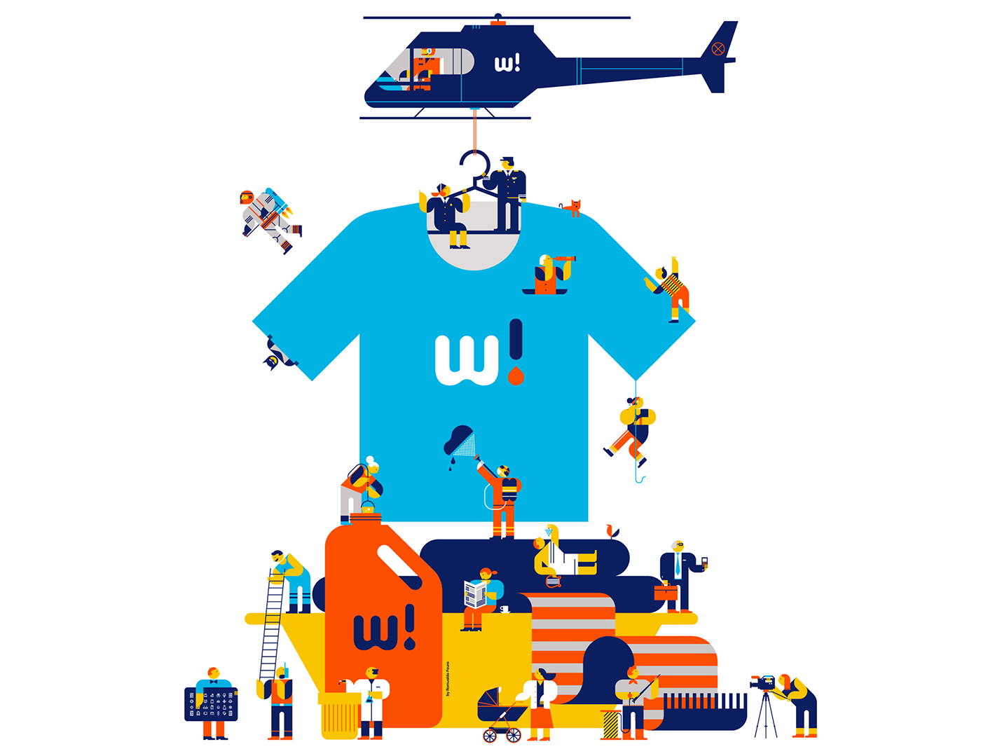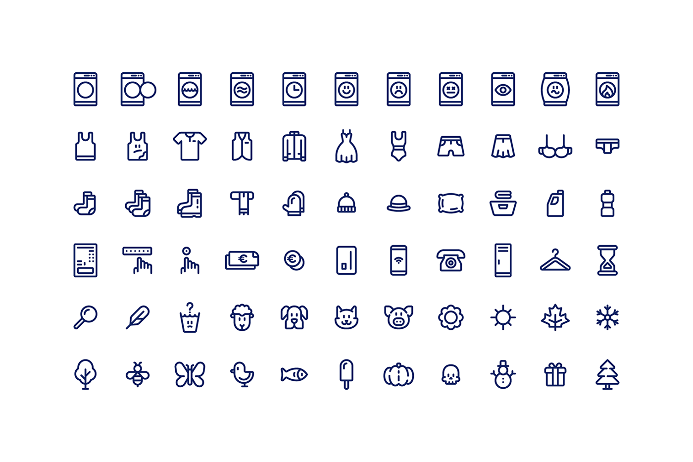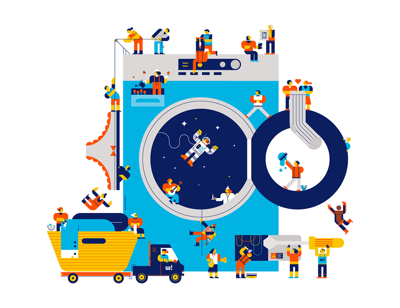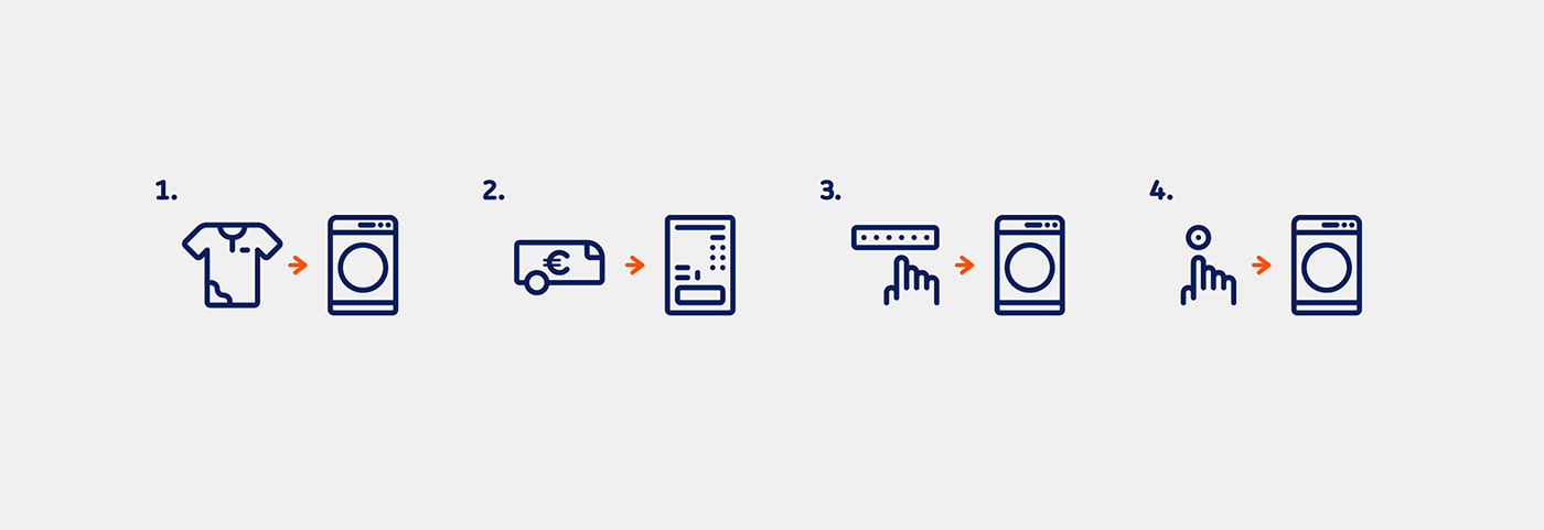 我們正在尋找一個流體和友好的外觀標志設計,我們決定使用圓形字體,其中的“w”和“a”已經被修改,以提供更多的個性。還制作了一個簡寫版本,并用作一個字母。然后我們開發了一個60多個系統圖標構建在40x40網格上,該網格存在于項目的大部分部分中。最后,我們做了一系列的插圖裝飾的地方,你可以看到各種字符與洗衣相關的元素。