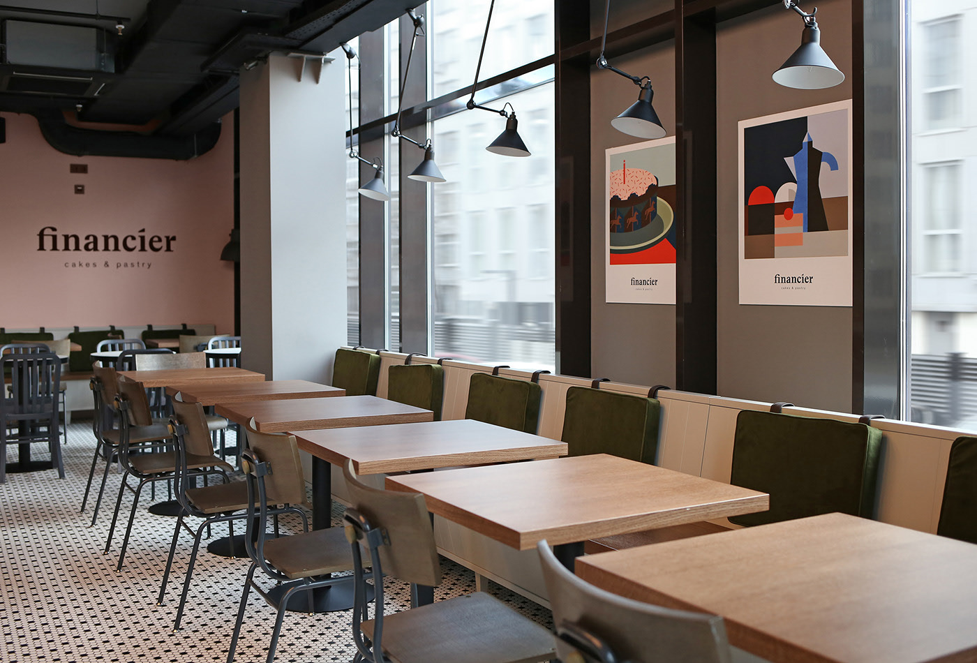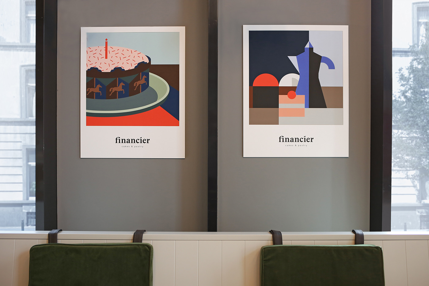 Financier餐飲行業(yè)咖啡館標(biāo)志設(shè)計(jì)更新升級(jí)。咖啡廳墻上的壁畫成為咖啡廳內(nèi)部的核心部分,并且是創(chuàng)建身份的起點(diǎn)。壁畫的色彩解決方案與咖啡館產(chǎn)品和室內(nèi)的主要色調(diào)相關(guān)。