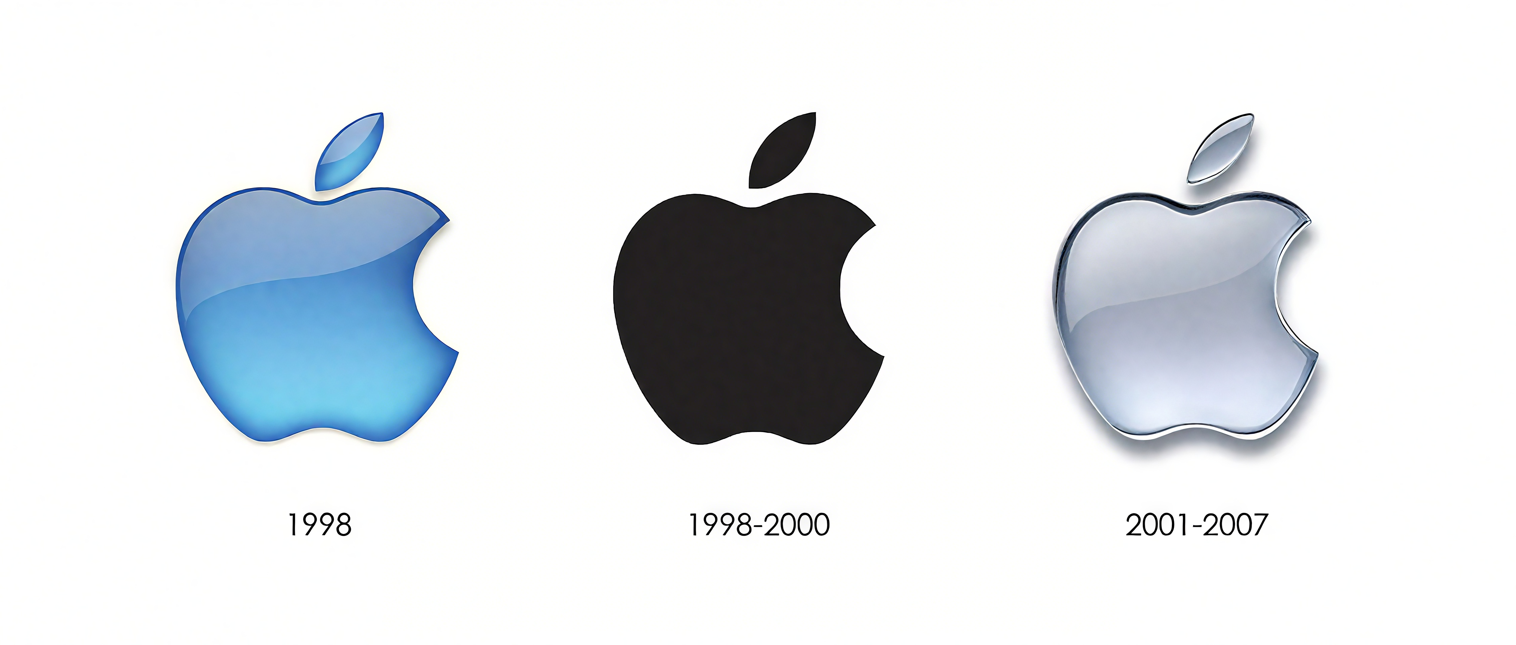 1998年iMac發(fā)布,LOGO變?yōu)榘胪该鞣鬯{(lán)色,適配產(chǎn)品果凍質(zhì)感,后因場景適配需求,替換為純黑版本;2001年iPod推出,LOGO升級為立體高光款,以光影分層強(qiáng)化高端感與視覺沖擊,契合產(chǎn)品定位。