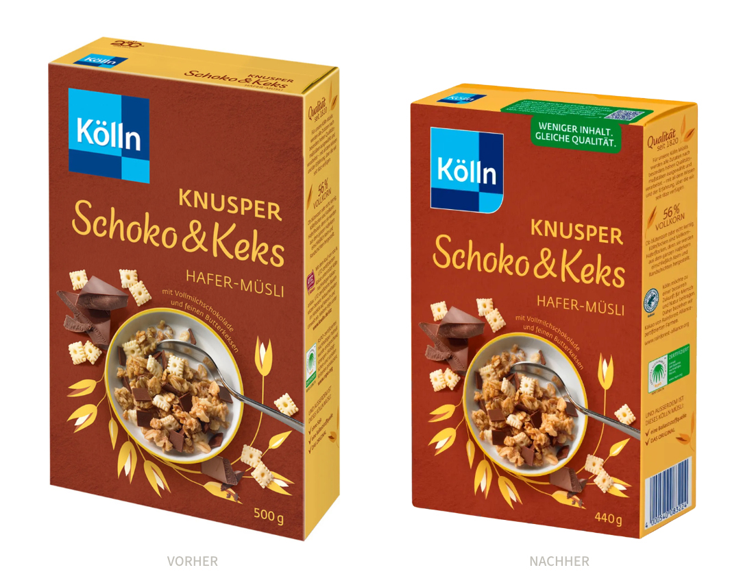 2.包裝調整:更換新logo時,包裝僅輕微改動,容量從500克減至440克但價格不變。與其他品牌不同,K?lln未掩蓋容量減少,而是在包裝右上角綠色背景印白色大字“容量更少,品質不變”。