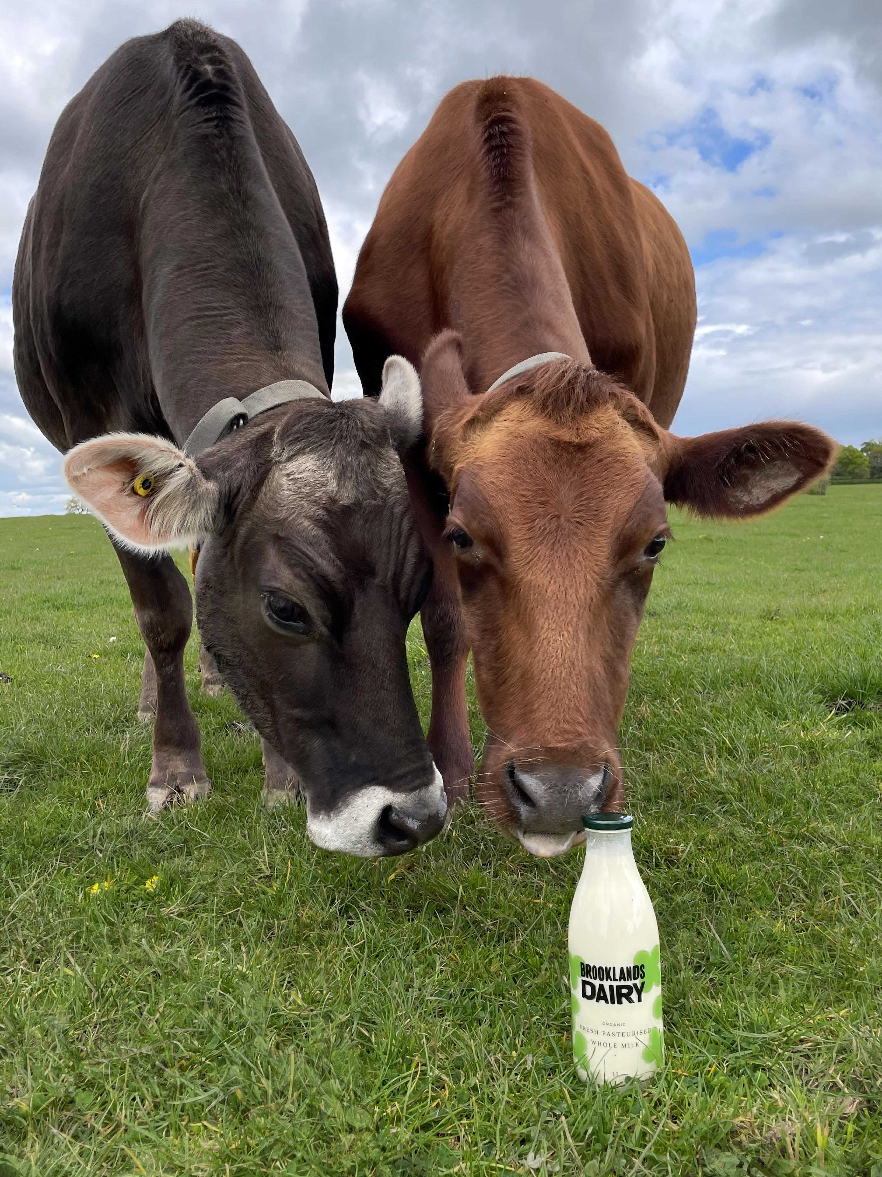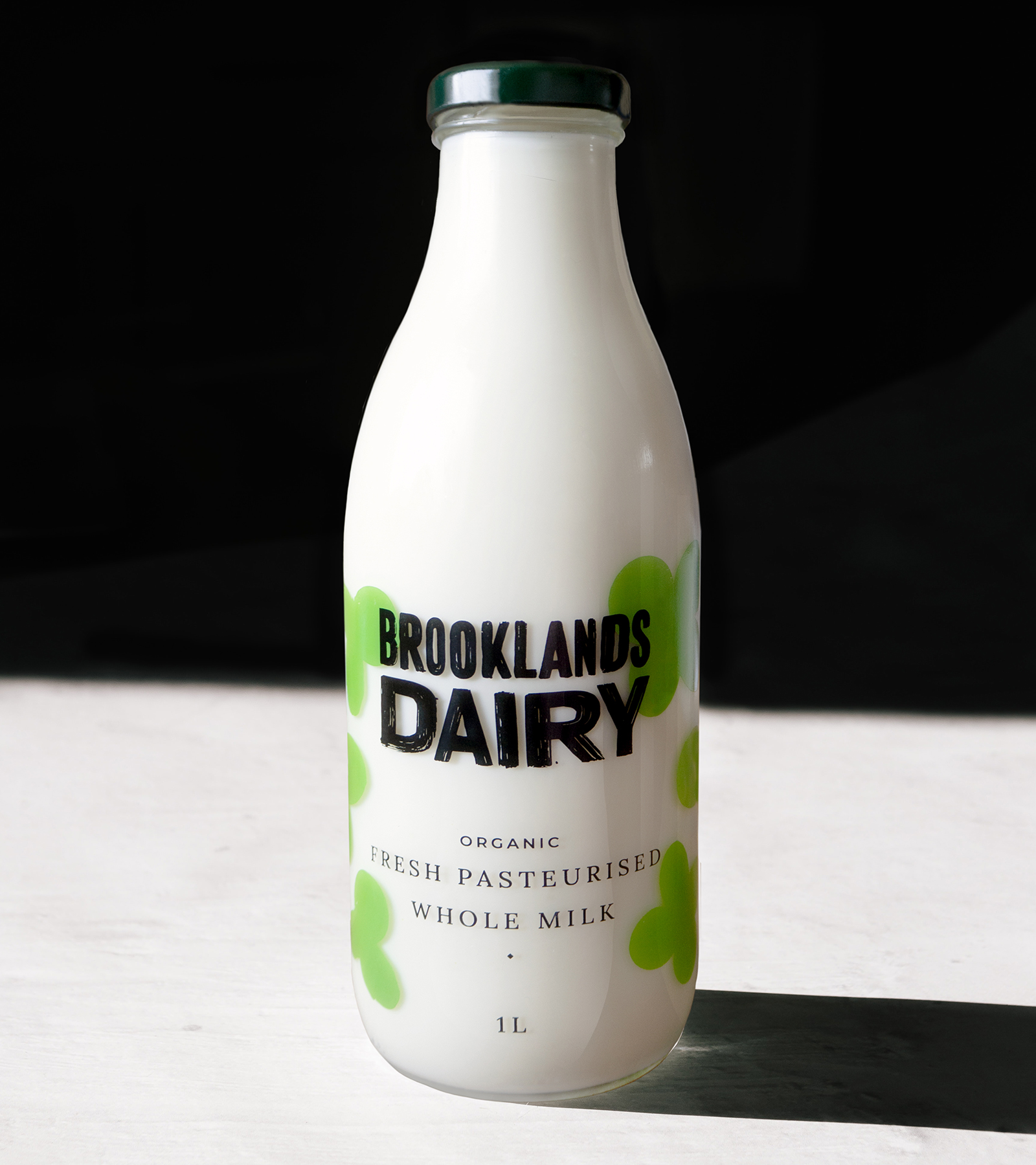 Brooklands Dairy 的新鮮巴氏殺菌全脂牛奶由農場的自動售貨機以可再灌裝的玻璃瓶裝運。Studio Unbound 和 Brooklands Dairy 決定特意模仿曾經在前門外等候的玻璃瓶牛奶