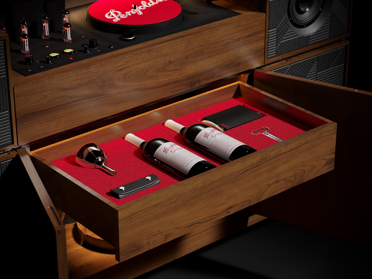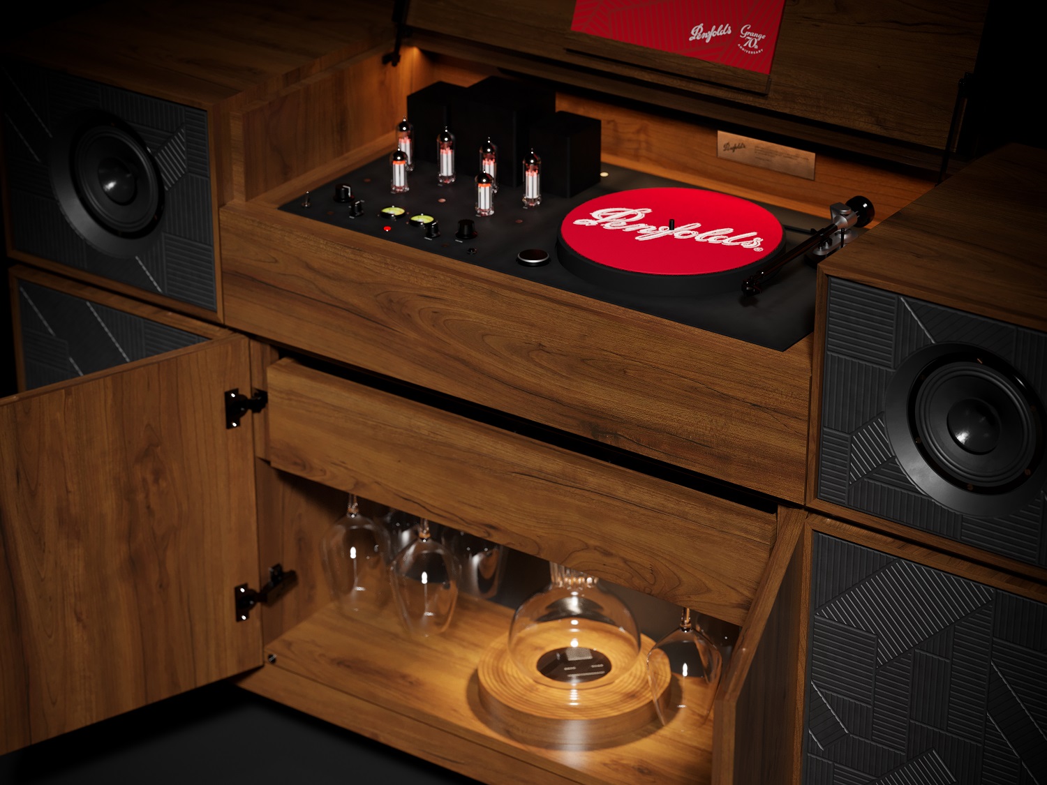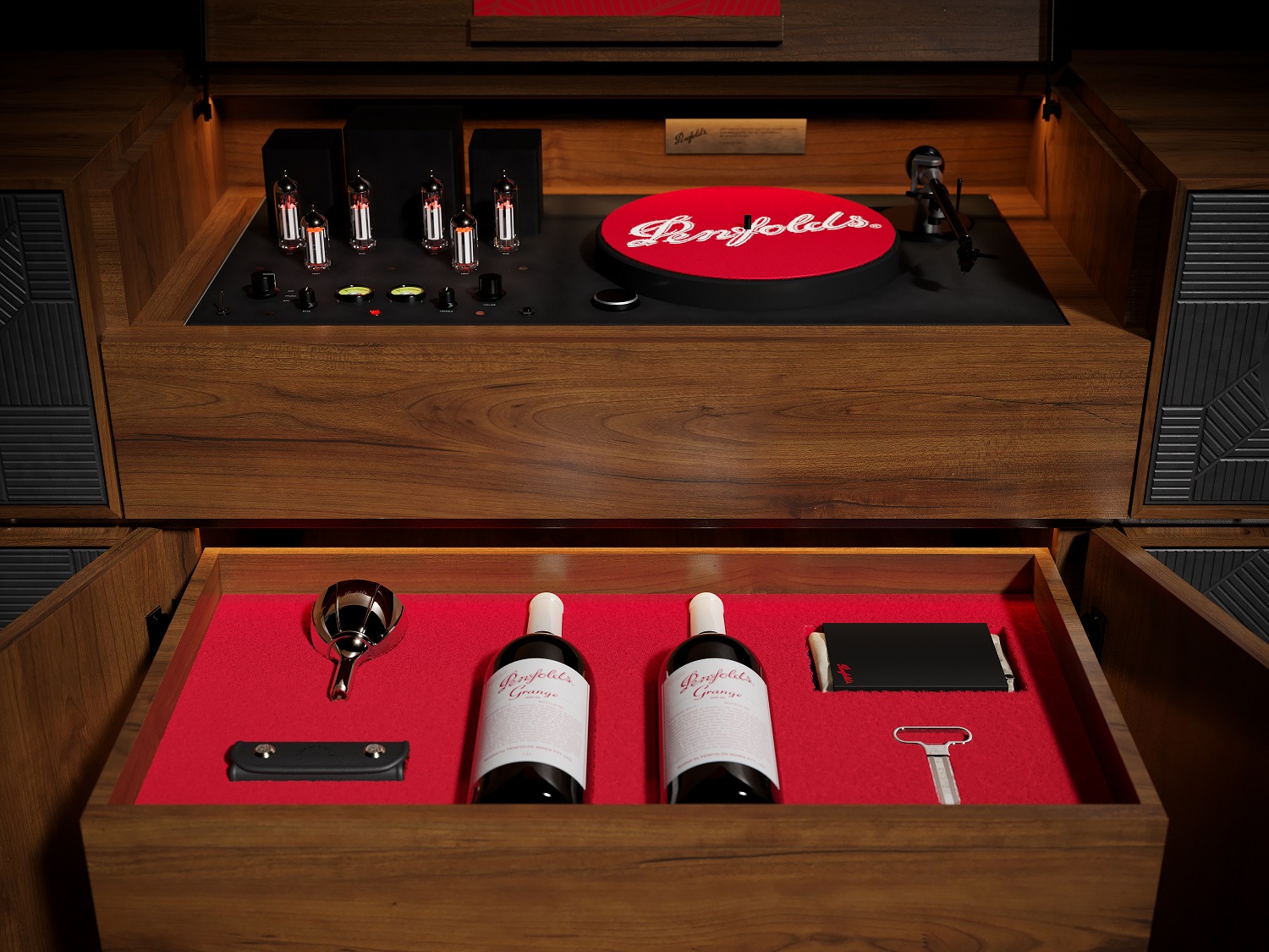 位于曼徹斯特的創意機構 Love 領導了 Grange 70 周年限量版電唱機控制臺的創意構思,這是一款帶有隱藏隔間的豪華電唱機,可容納 Penfolds Grange magnum 限量版二重奏,以幫助這位澳大利亞釀酒師慶祝 Grange 周年紀念里程碑。