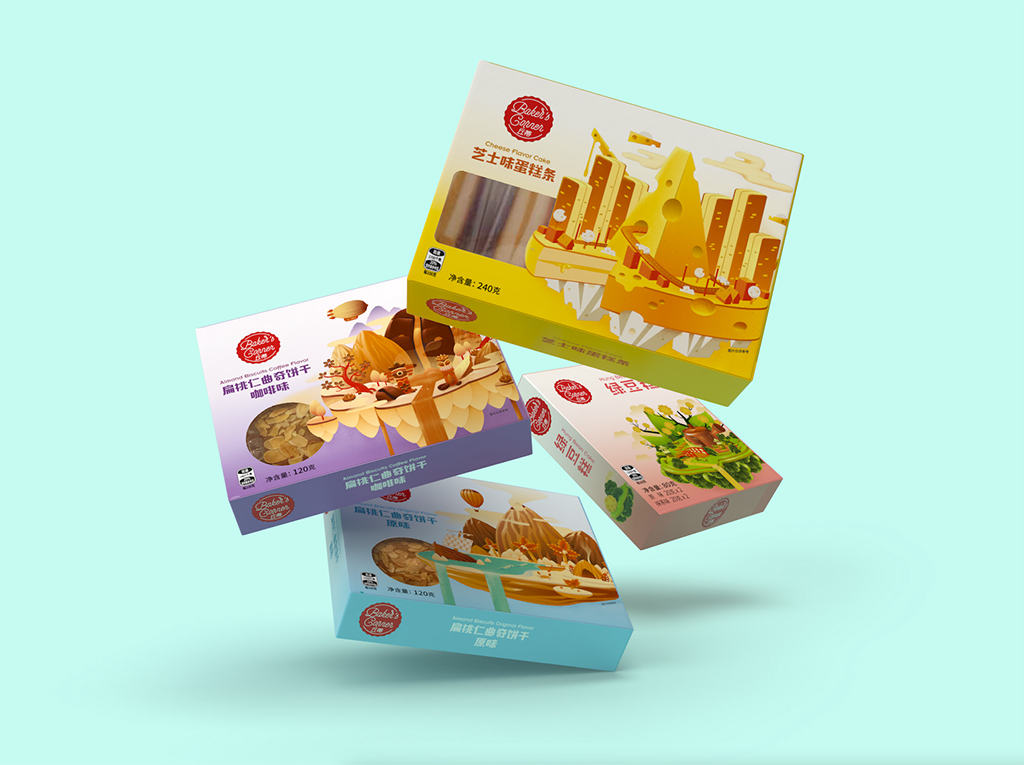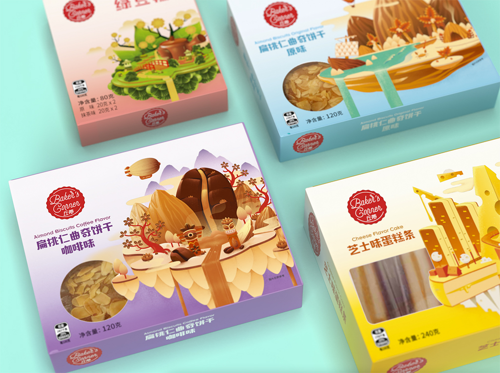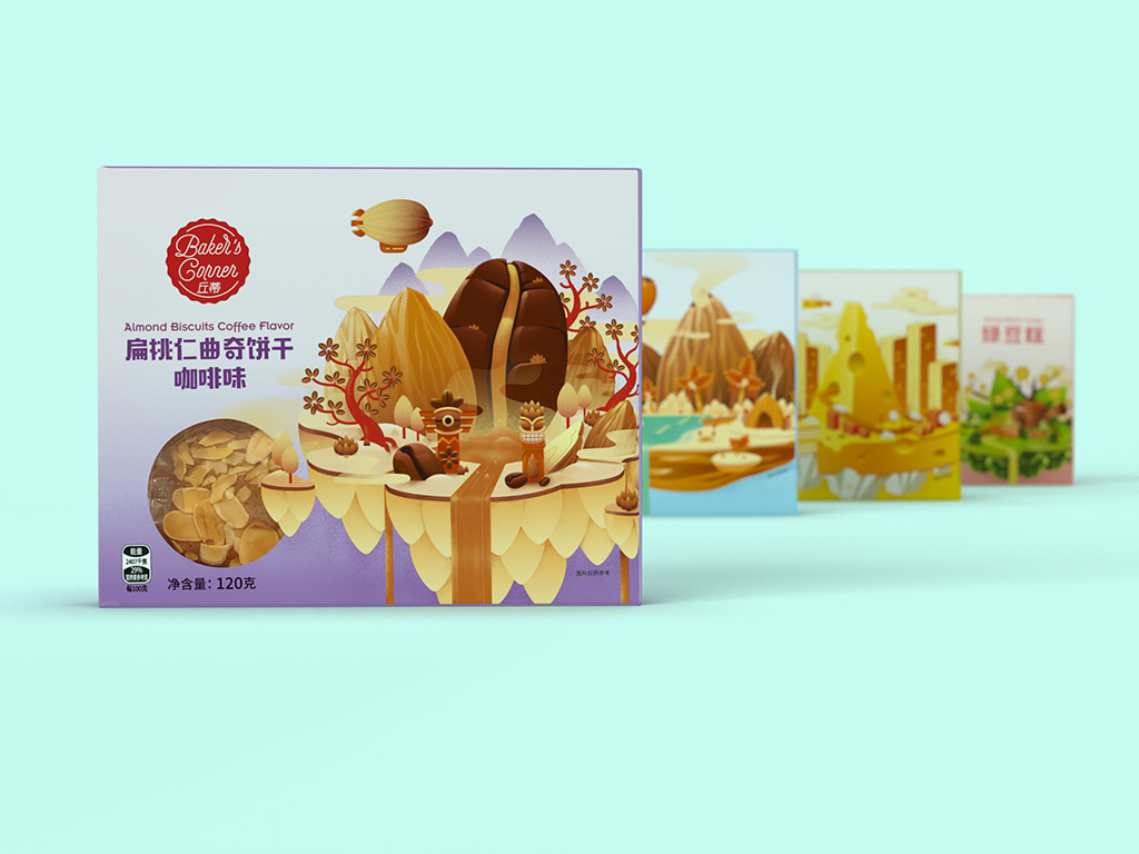 產品包裝設計(是的,這個雙關語是有意的)。我們的創意人員在設計這個系列時很開心。在構思和概念化之后,他們將 Bakers Corner 帶入了生活,這是一個反對全麥并擾亂市場的品牌,面向年輕觀眾。從杏仁氣球到奶酪宇宙飛船,這些設計囊括了多代目標市場尋求冒險的白日夢者的精髓。